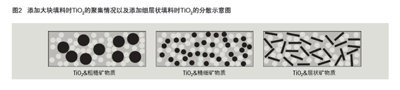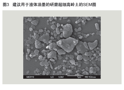 因此,當PVC為30%時,降低鈦白粉用量,配制白色液體油 墨,獲得總體不透明度最佳還是有可能的。該方法已成功應用于 高光/半光涂料,適當降低PVC含量,使用礦物填料優化鈦白粉含量和不透明性(舉例參見文獻[5-8])。據報道,與粗顆粒和塊狀顆 粒相比,具有層狀結構的細礦物顆粒(如高嶺土)更加有效,具 體效果見圖2所示,這種層狀顆粒可改善不透明度的原因在于TiO2 聚集體[9]較少,TiO2顆粒的吸收和粗糙效果[8]和TiO2顆粒可能被間 隔,不過文獻中對所述效果仍存在不同觀點[10]。因此,本研究重 點是使用超細高嶺土優化高TiO2含量的水性柔版印刷油墨配方,旨 在保持光澤和不透明度不變。