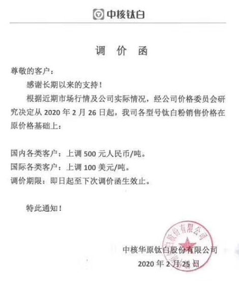 2020年2月25日,中核華原鈦白股份公司發(fā)布調(diào)價函通知,根據(jù)目前市場及實際情況,經(jīng)公司價格委員會研究決定從2020年2月26日起,調(diào)整公司各個型號鈦白粉市場價格。