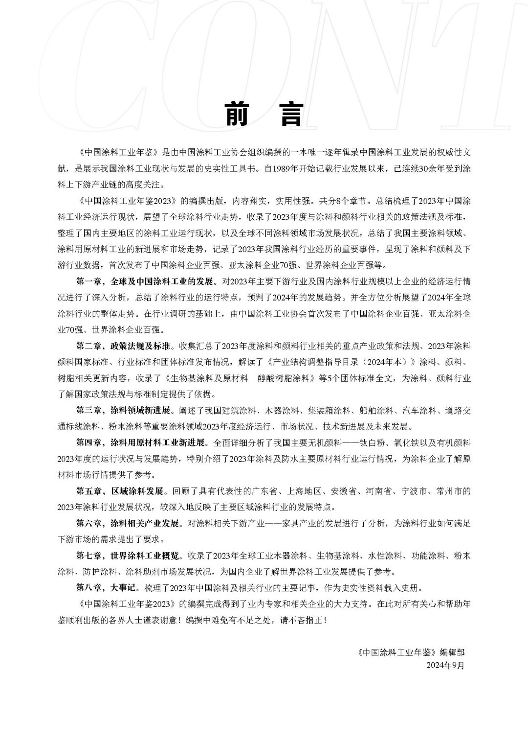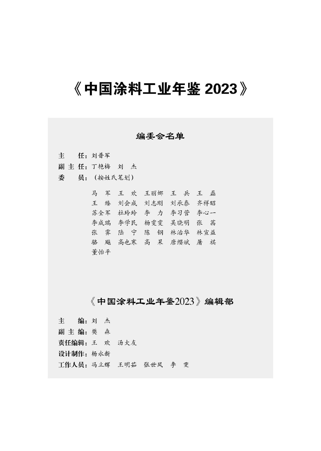 《中國涂料工業(yè)年鑒2023》的編撰完成得到了業(yè)內專家和相關企業(yè)的大力支持。在此對所有關心和幫助年鑒順利出版的各界人士謹表謝意!編撰中難免有不足之處,請不吝指正!