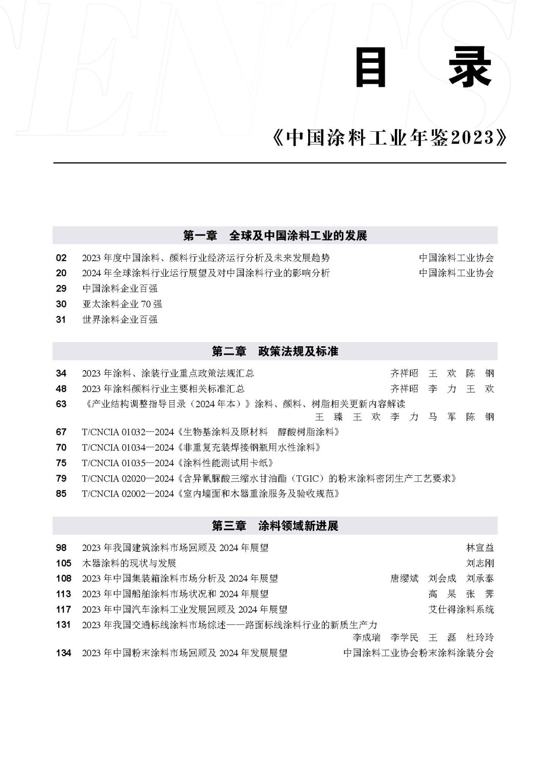 《中國涂料工業(yè)年鑒2023》的編撰出版,內容翔實,實用性強。共分8個章節(jié)。總結梳理了2023年中國涂料工業(yè)經(jīng)濟運行現(xiàn)狀,展望了全球涂料行業(yè)走勢,收錄了2023年度與涂料和顏料行業(yè)相關的政策法規(guī)及標準,整理了國內主要地區(qū)的涂料工業(yè)運行現(xiàn)狀,以及全球不同涂料領域市場發(fā)展狀況,總結了我國主要涂料領域、涂料用原材料工業(yè)的新進展和市場走勢,記錄了2023年我國涂料行業(yè)經(jīng)歷的重要事件,呈現(xiàn)了涂料和顏料及下游行業(yè)數(shù)據(jù),首次發(fā)布了中國涂料企業(yè)百強、亞太涂料企業(yè)70強、世界涂料企業(yè)百強等。