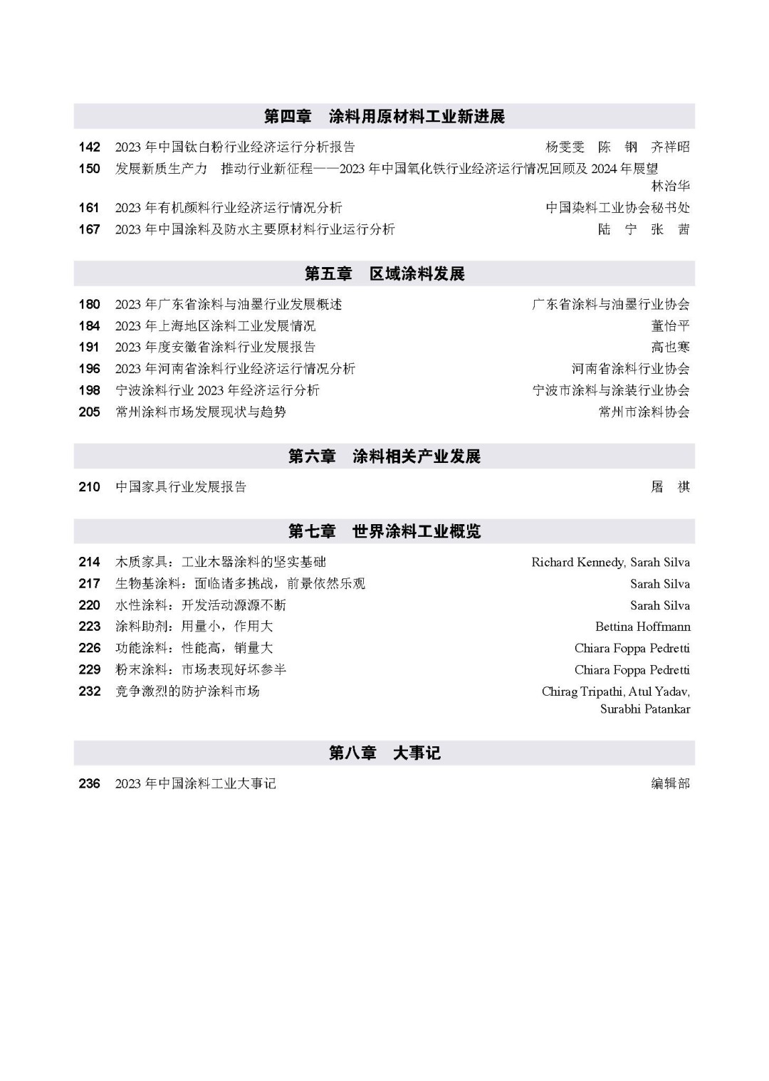第七章,世界涂料工業(yè)概覽。收錄了2023年全球工業(yè)木器涂料、生物基涂料、水性涂料、功能涂料、粉末涂料、防護涂料、涂料助劑市場發(fā)展狀況,為國內企業(yè)了解世界涂料工業(yè)發(fā)展提供了參考。