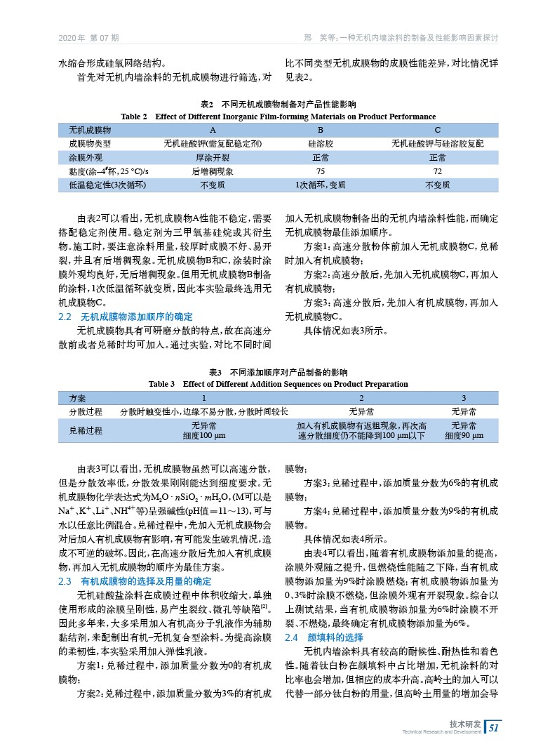 針對軌道交通項目要求,研究制備了一種無機內墻涂料。根據無機成膜物的篩選、無機成膜物的制備工藝、有機成膜物添加量以及顏填料的選擇等4個方面進行研究,最終制備出一種適合軌道交通項目的產品,目前該產品已在市場大量應用,受到客戶好評。