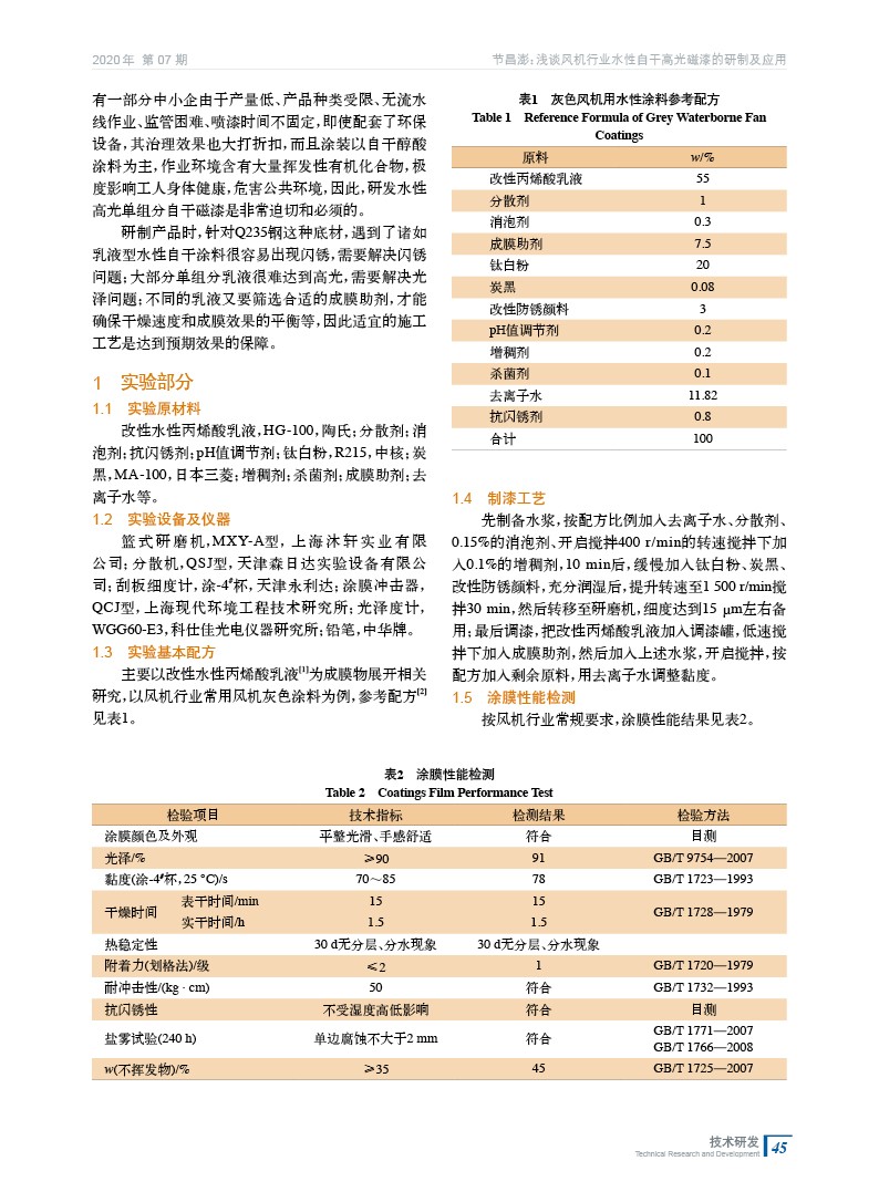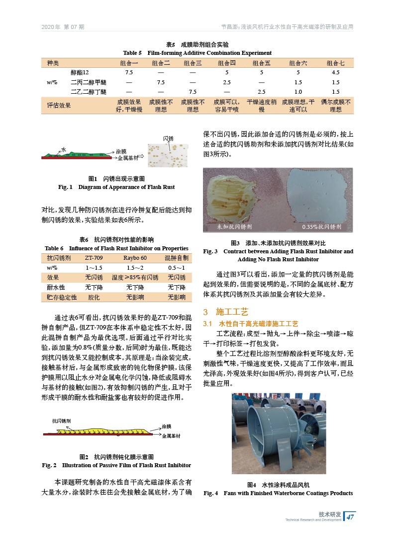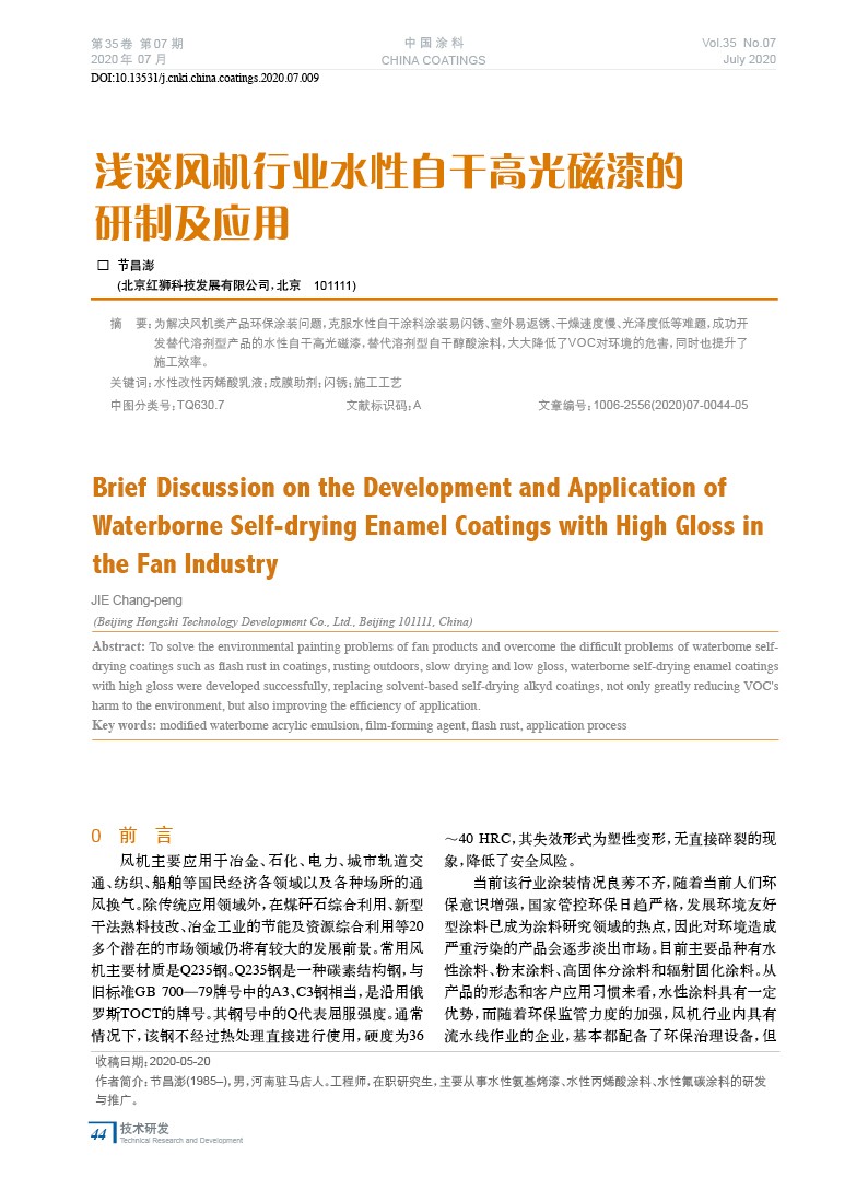 為解決風機類產品環保涂裝問題,克服水性自干涂料涂裝易閃銹、室外易返銹、干燥速度慢、光澤度低等難題,成功開發替代溶劑型產品的水性自干高光磁漆,替代溶劑型自干醇酸涂料,大大降低了VOC對環境的危害,同時也提升了施工效率。
