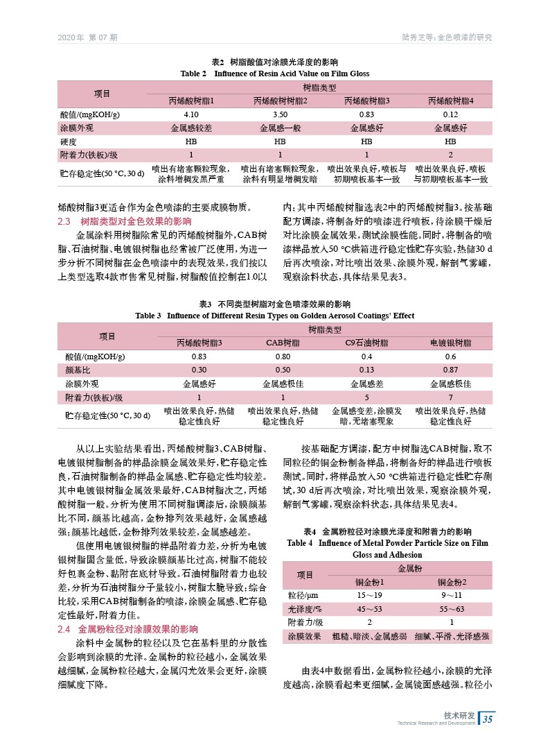 與普通色噴漆相比,加入金屬顏料的噴漆能夠呈現出良好的金屬效果,涂膜金屬質感強,具有較好的裝飾效果。主要研究以銅金粉顏料為主的金色氣霧型噴漆,對比分析樹脂的酸值、樹脂類型、金屬粉粒徑、流平劑用量、料氣比對金色噴漆噴涂效果的影響。