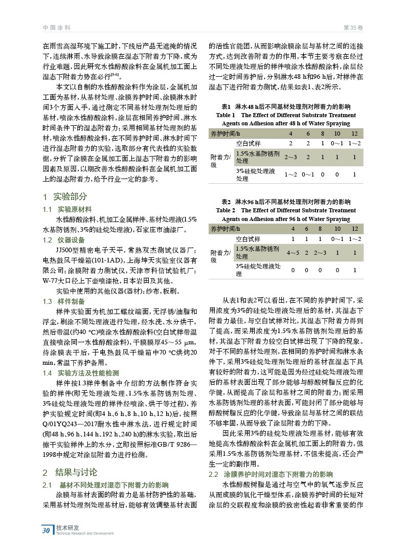 摘要:以自制的水性醇酸涂料為涂層,金屬機加工面為基材,討論了基材處理劑、養護時間、淋水時間對涂層在金屬加工面上濕態下附著力的影響。采用濃度為3%的硅烷處理液處理基材能夠有效地提高涂層在金屬加工面上的附著力;隨著養護時間和淋水時間的延長,能夠在一定程度上改善水性醇酸涂料在金屬加工面上的濕態附著力較差的現象。