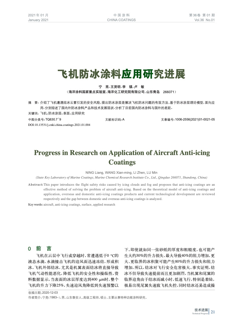 摘要:介紹了飛機遭遇結(jié)冰云霧引發(fā)的安全風險,提出防冰涂層是解決飛機防冰問題的有效方法。基于防冰涂層理論模型,面向應(yīng)用,分別綜述了國內(nèi)外防冰涂料產(chǎn)品和技術(shù)發(fā)展現(xiàn)狀,分析了目前國內(nèi)防冰涂料與國外的差距。
