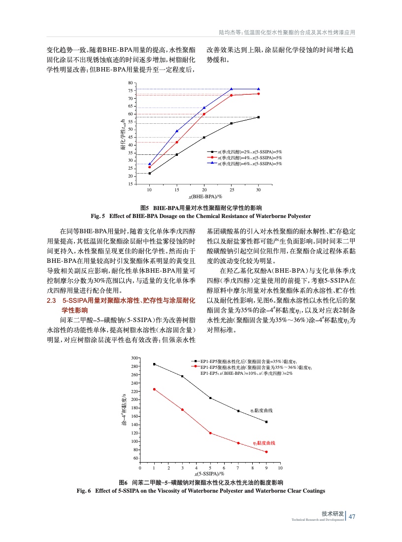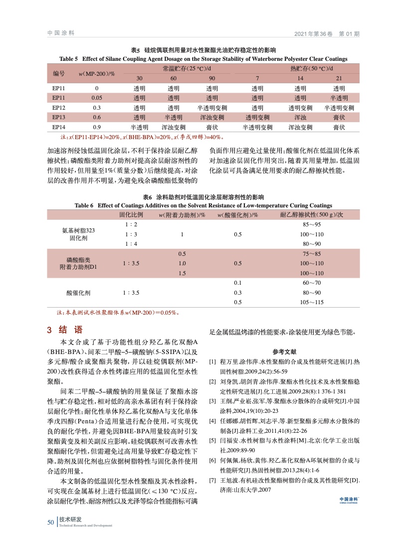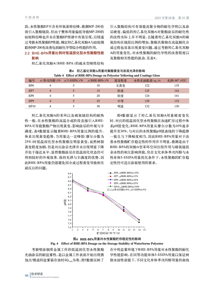 摘要:基于功能性組分羥乙基化雙酚A,間苯二甲酸-5-磺酸鈉以及多元醇/酸合成聚酯共聚物,并以硅烷偶聯劑改性獲得適合低溫固化型水性烤漆的水性聚酯;研究了羥乙基化雙酚A,間苯二甲酸-5-磺酸鈉,支化組分以及硅烷偶聯劑對性能的影響;同時考察了涂料助劑對低溫固化涂層性能的合適用量。