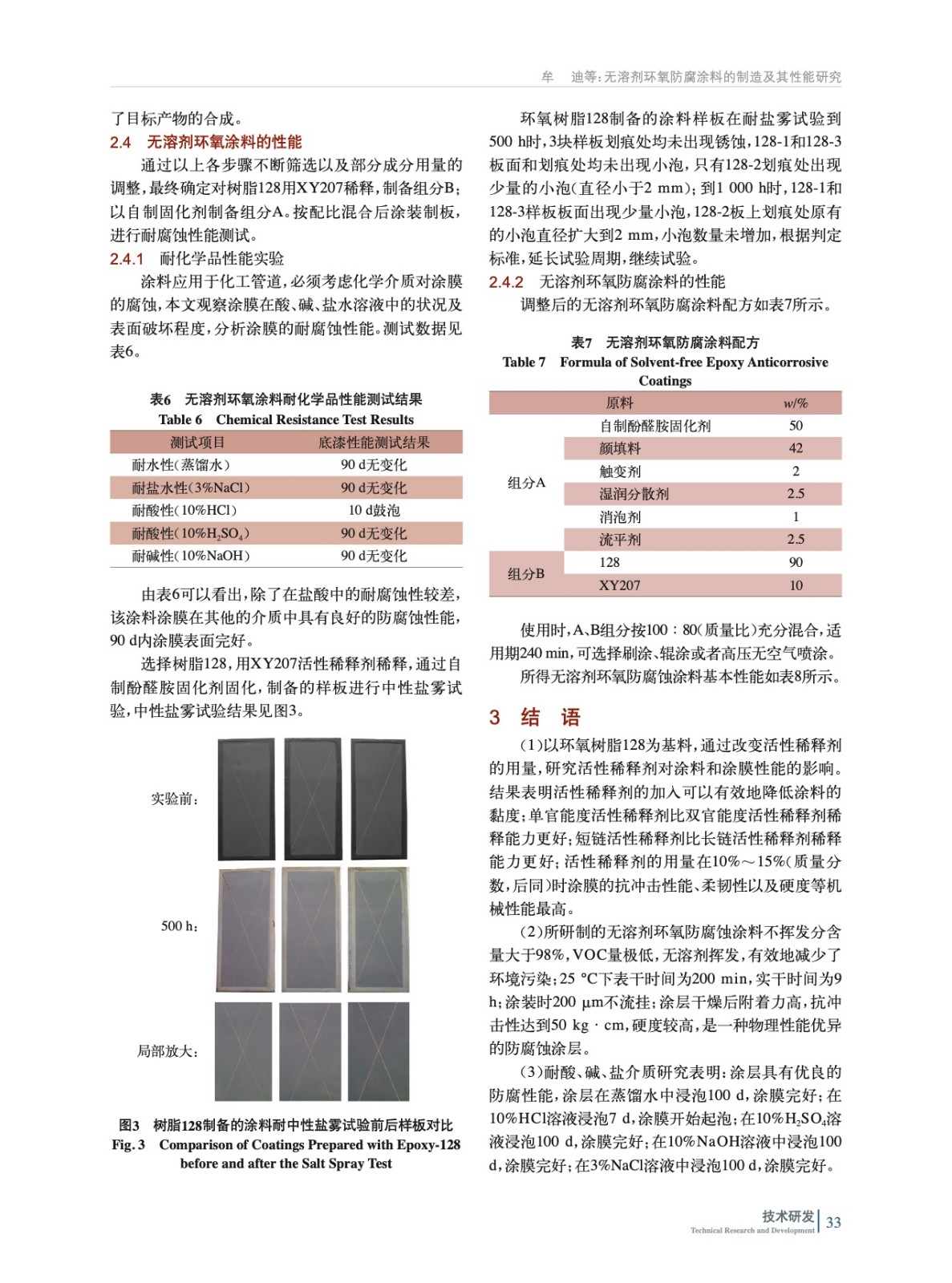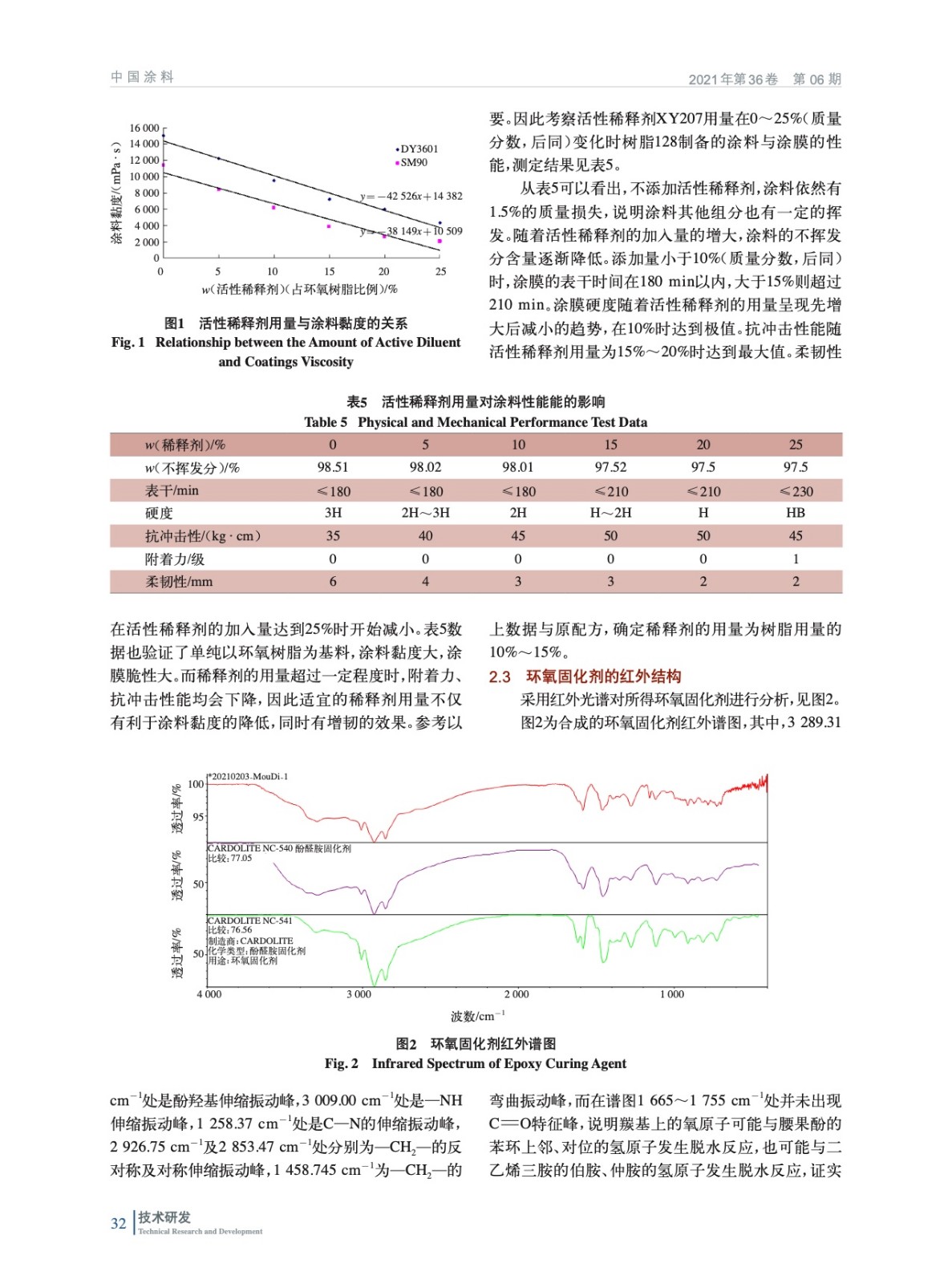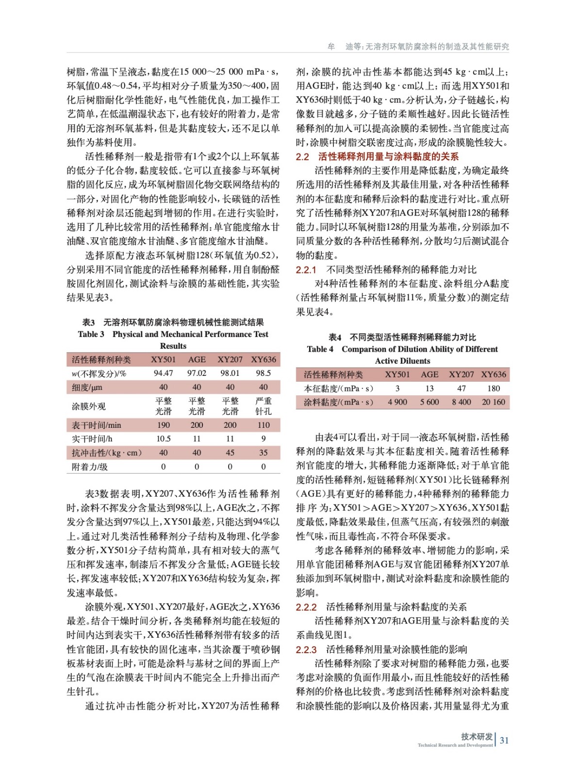 摘要:以低分子量液態環氧樹脂為主成膜物質,加入活性稀釋劑、顏填料與助劑,制備并考察了無溶劑環氧防腐涂料的組成與綜合性能的關系。研究發現:活性稀釋劑的稀釋能力隨著其官能團數量的增大而減小。活性稀釋劑質量分數在0~25%,隨著活性稀釋劑用量的增加,涂膜的干燥時間越來越長;硬度和柔韌性呈現先增大后減小的變化,在15%時性能最佳;而抗沖擊性則在15%~20%時達到最大值。