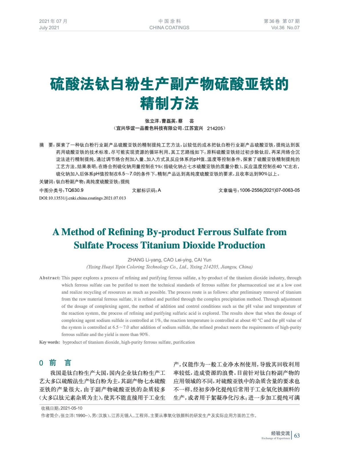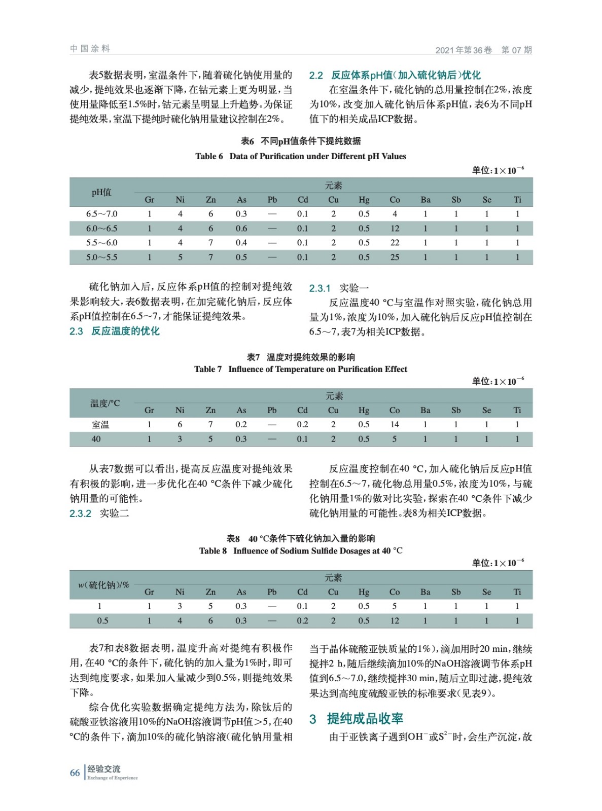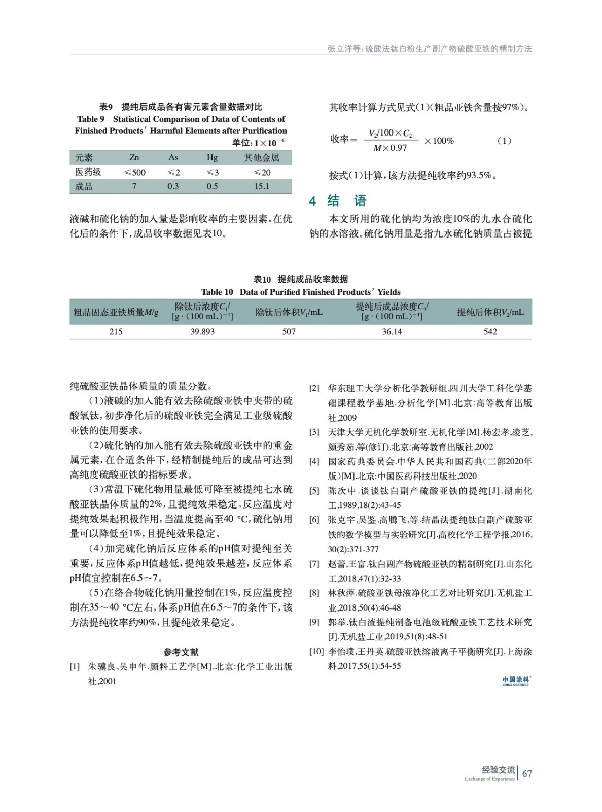 摘要:探索了一種鈦白粉行業(yè)副產(chǎn)品硫酸亞鐵的精制提純工藝方法,以較低的成本把鈦白粉行業(yè)副產(chǎn)品硫酸亞鐵,提純達(dá)到醫(yī)藥用硫酸亞鐵的技術(shù)標(biāo)準(zhǔn),盡可能實(shí)現(xiàn)資源的循環(huán)利用。結(jié)果表明:在絡(luò)合劑硫化鈉用量控制在1%(指硫化鈉占七水硫酸亞鐵的質(zhì)量分?jǐn)?shù)),反應(yīng)溫度控制在40 ℃左右,硫化鈉加入后體系pH值控制在6.5~7.0的條件下,精制產(chǎn)品達(dá)到高純度硫酸亞鐵的要求,且收率達(dá)到90%以上。