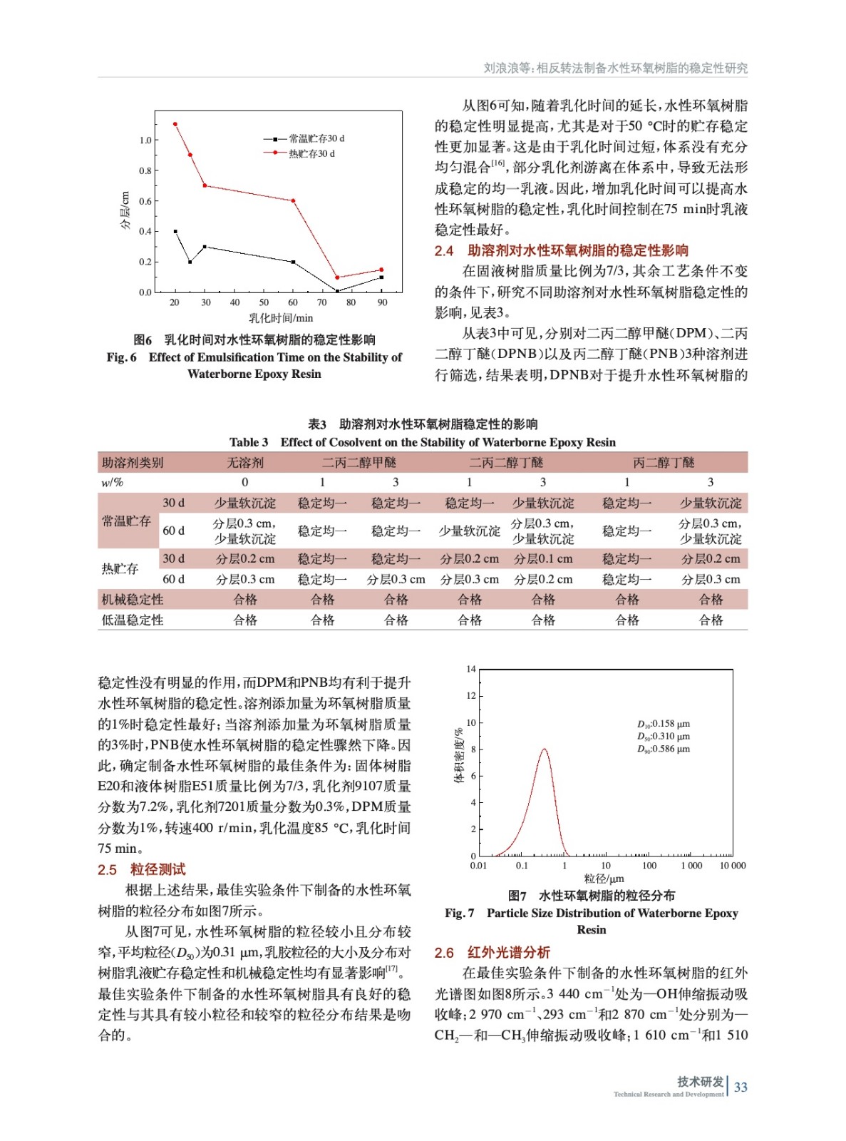 摘要:對相反轉法制備的水性環氧樹脂的穩定性因素進行了探討,研究結果表明:采用固體樹脂E20和液體樹脂E51質量比為7/3,乳化劑9107含量為7.2%,乳化劑7201含量0.3%,二丙二醇甲醚含量1%,轉速400 r/min,乳化溫度85 ℃,乳化時間75 min,在此最佳條件下制備的水性環氧樹脂穩定性良好,平均粒徑為0.31 μm。
