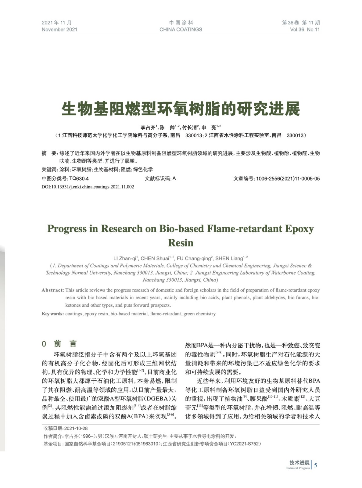 摘要:綜述了近年來國(guó)內(nèi)外學(xué)者在以生物基原料制備阻燃型環(huán)氧樹脂領(lǐng)域的研究進(jìn)展,主要涉及生物酸、植物酚、植物醛、生物呋喃、生物酮等類型,并進(jìn)行了展望。