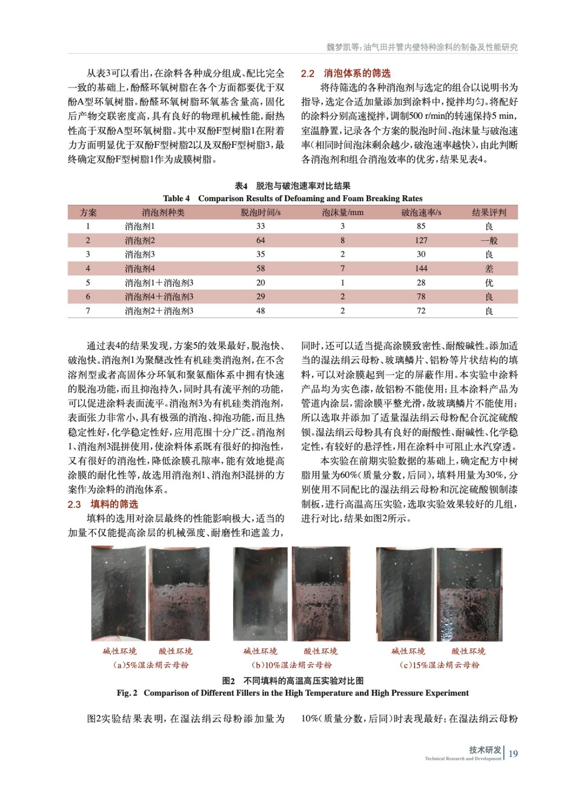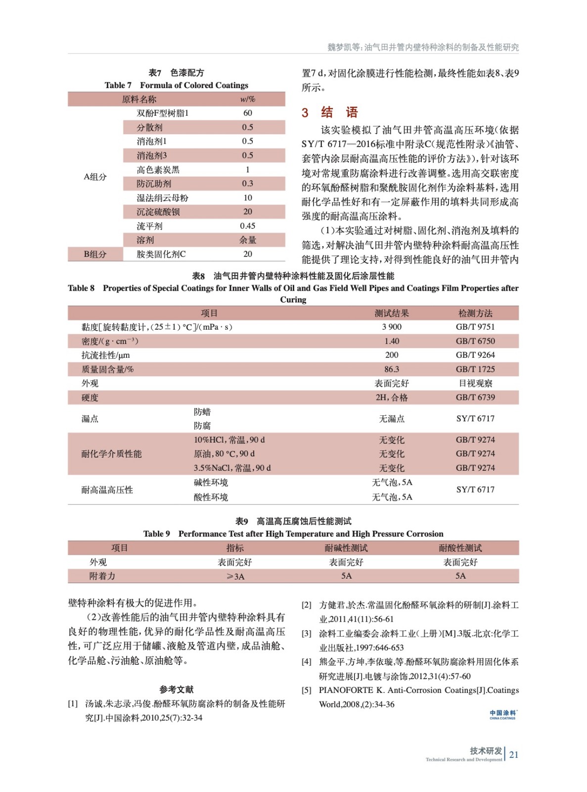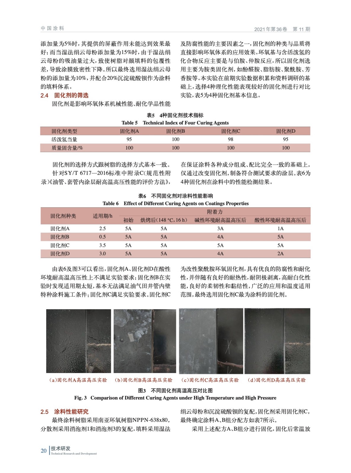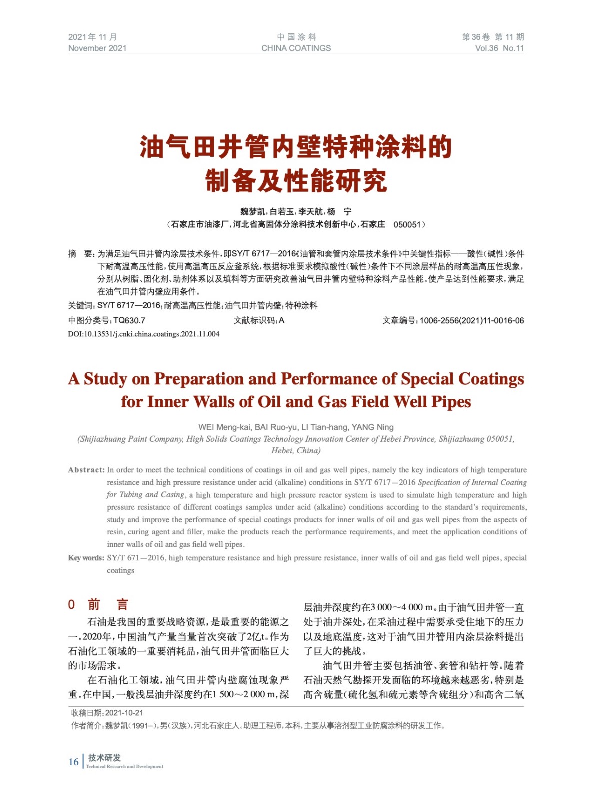 摘要:為滿足油氣田井管內(nèi)涂層技術(shù)條件,即SY/T 6717—2016《油管和套管內(nèi)涂層技術(shù)條件》中關(guān)鍵性指標(biāo)——酸性(堿性)條件下耐高溫高壓性能,使用高溫高壓反應(yīng)釜系統(tǒng),根據(jù)標(biāo)準(zhǔn)要求模擬酸性(堿性)條件下不同涂層樣品的耐高溫高壓性現(xiàn)象,分別從樹脂、固化劑、助劑體系以及填料等方面研究改善油氣田井管內(nèi)壁特種涂料產(chǎn)品性能。使產(chǎn)品達到性能要求,滿足在油氣田井管內(nèi)壁應(yīng)用條件。