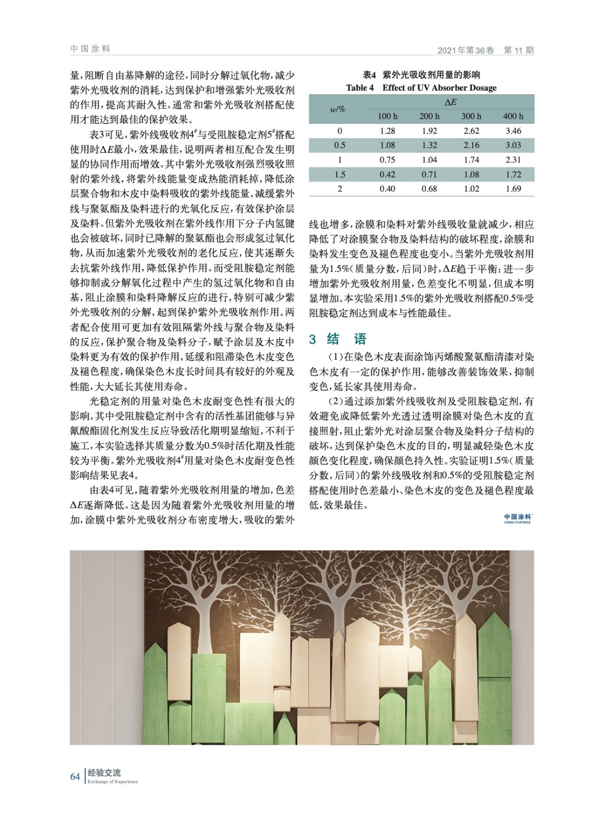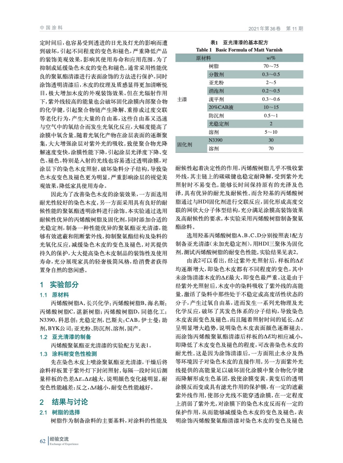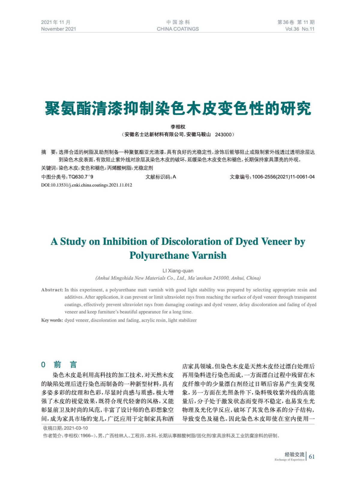 選擇合適的樹脂及助劑制備一種聚氨酯亞光清漆,具有良好的光穩定性,涂飾后能夠阻止或限制紫外線透過透明涂層達到染色木皮表面,有效阻止紫外線對涂層及染色木皮的破壞,延緩染色木皮變色和褪色,長期保持家具漂亮的外觀。