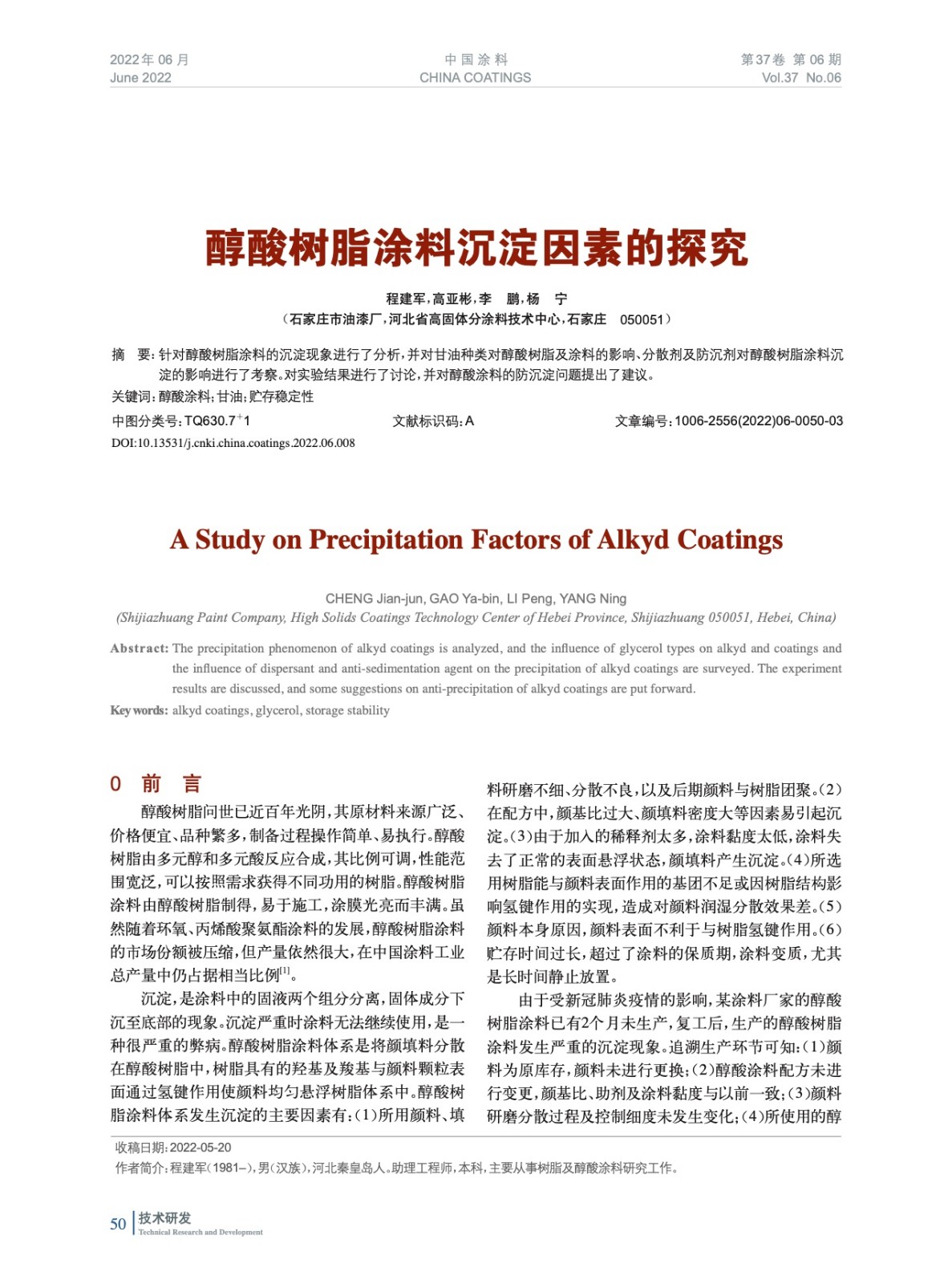 針對醇酸樹脂涂料的沉淀現象進行了分析,并對甘油種類對醇酸樹脂及涂料的影響、分散劑及防沉劑對醇酸樹脂涂料沉淀的影響進行了考察。對實驗結果進行了討論,并對醇酸涂料的防沉淀問題提出了建議。