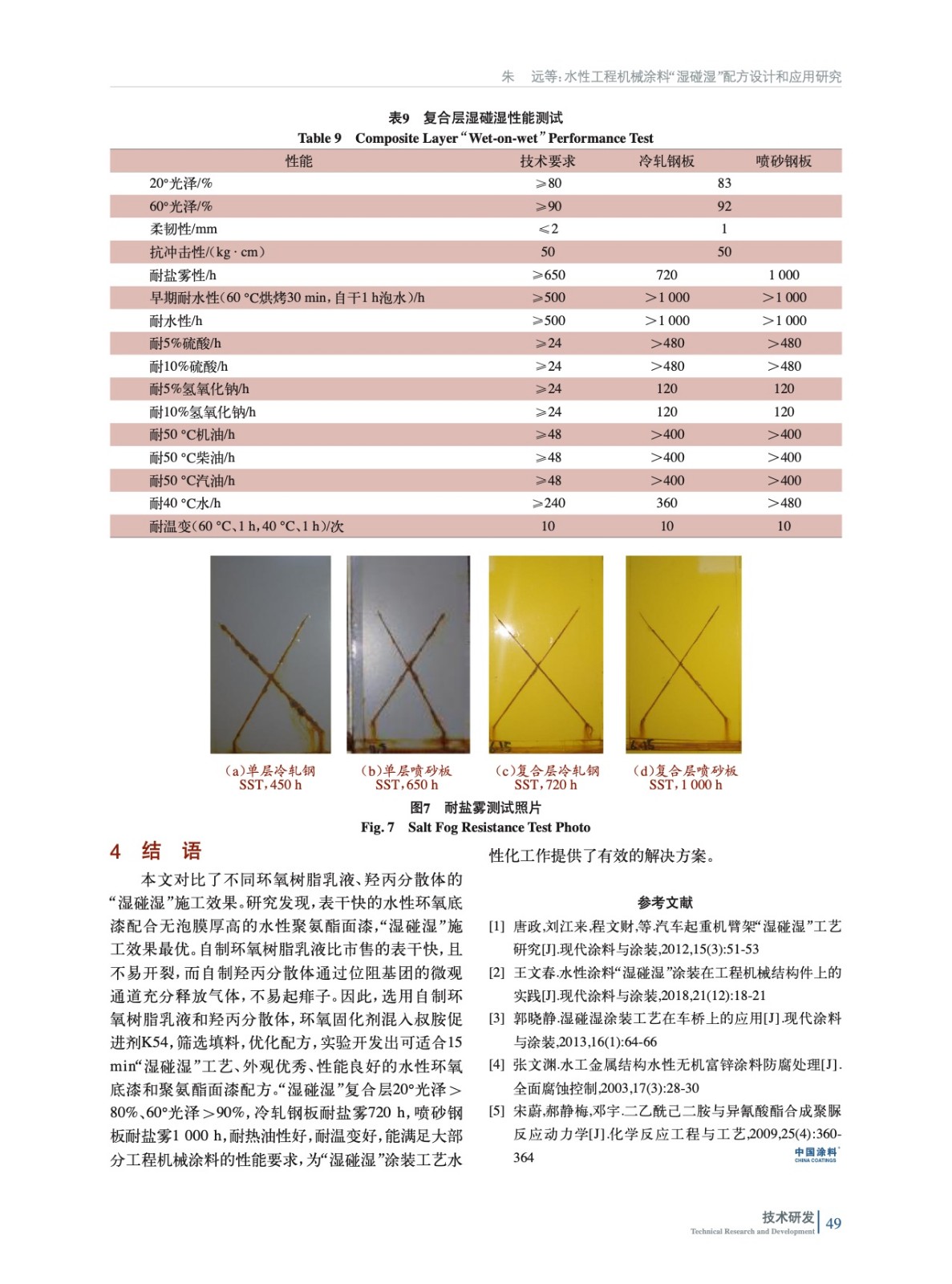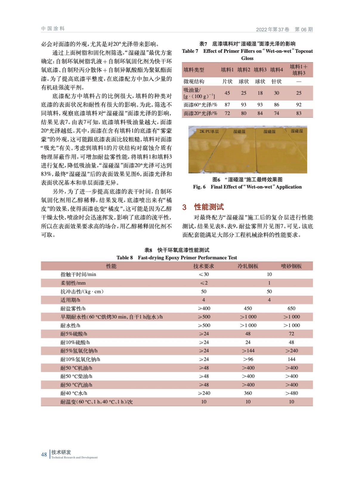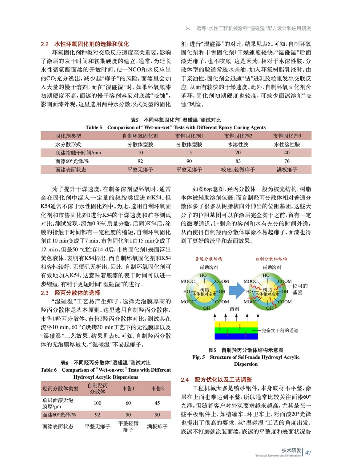 通過使用快干的水性環氧樹脂和固化劑、高無泡膜厚的水性羥丙分散體和固化劑,并通過配方優化,開發了兼顧長期性能和施工性能的水性工程機械底漆和面漆涂料配方,能滿足間隔15 min的環氧底漆“濕碰濕”聚氨酯面漆施工工藝要求。