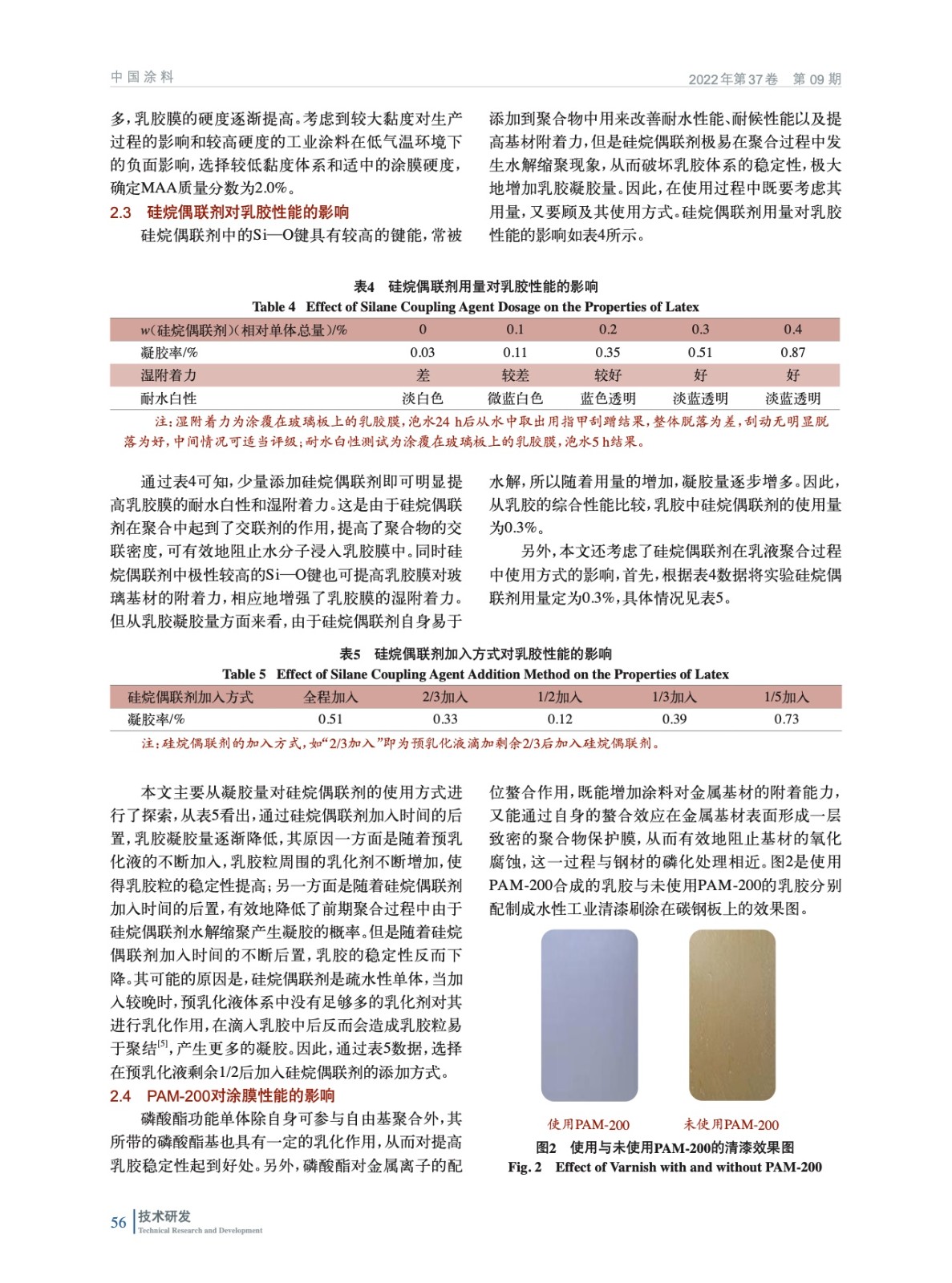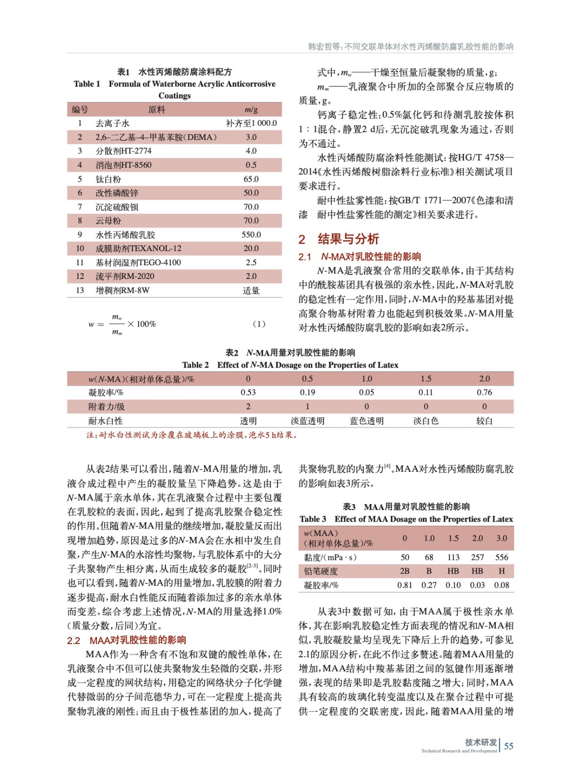 摘要:研究了N–羥甲基丙烯酰胺、甲基丙烯酸、硅烷偶聯劑以及磷酸酯功能單體4種不同交聯單體對丙烯酸乳膠的性能影響。數據表明,適量加入N-MA會提高乳膠的穩定性,過多加入則會導致乳膠凝膠量增多,同時引起乳膠膜耐水性下降;MAA質量分數為2.0%時,對提高聚合物交聯密度和涂膜硬度有作用;硅烷偶聯劑質量分數為0.3%時,且采用后加入方式有利于提高乳膠穩定性;磷酸酯功能單體對改善涂膜耐鹽霧性能效果顯著。