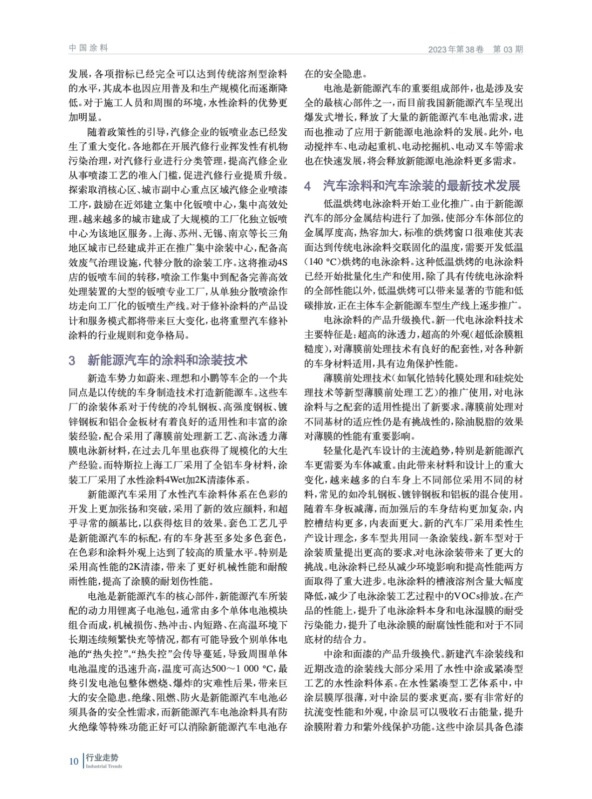 摘要:綜述了中國(guó)汽車工業(yè)2022年的發(fā)展?fàn)顩r,從汽車涂裝和涂料行業(yè)的最新政策法規(guī)、技術(shù)進(jìn)步、產(chǎn)量和品種情況、企業(yè)的升級(jí)和發(fā)展、汽車修補(bǔ)涂料市場(chǎng)需求5個(gè)方面匯總了中國(guó)汽車涂料工業(yè)2022年度發(fā)展?fàn)顩r,還重點(diǎn)介紹了新能源汽車的涂料和涂裝技術(shù)、汽車涂料和汽車涂裝的最新技術(shù)發(fā)展、中國(guó)汽車涂料產(chǎn)業(yè)的發(fā)展趨勢(shì)和面臨的挑戰(zhàn),并對(duì)2023年中國(guó)汽車涂料工業(yè)的發(fā)展進(jìn)行了展望。