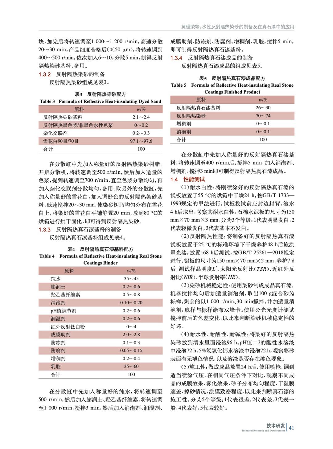 摘要:研究了不同的顏填料種類以及用量對反射隔熱染砂的耐磨性、耐水性、耐溶劑性、耐人工老化性以及反射隔熱性能的影響。結果表明:當紅外反射鈦白粉用量在25%~35%(質量分數,后同),人工染砂乳膠用量在40%~45%,雜化交聯劑用量在0.1%~0.15%,與天然雪花白進行染色處理,其制得的反射隔熱染砂,不僅具有優異的機械穩定性、顏色均勻度,而且具有優異的貯存穩定性、耐水性、耐酸性、耐堿性和耐人工老化性,添加在真石漆中具有優異的反射隔熱性能。