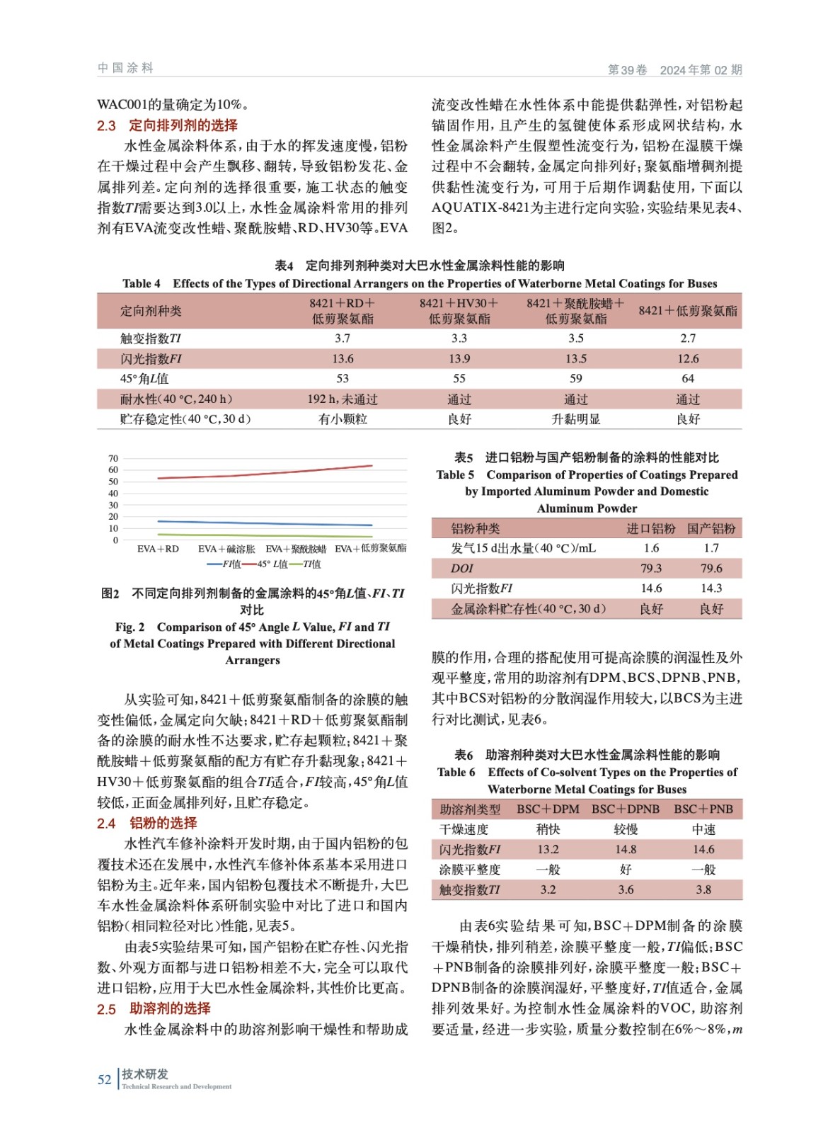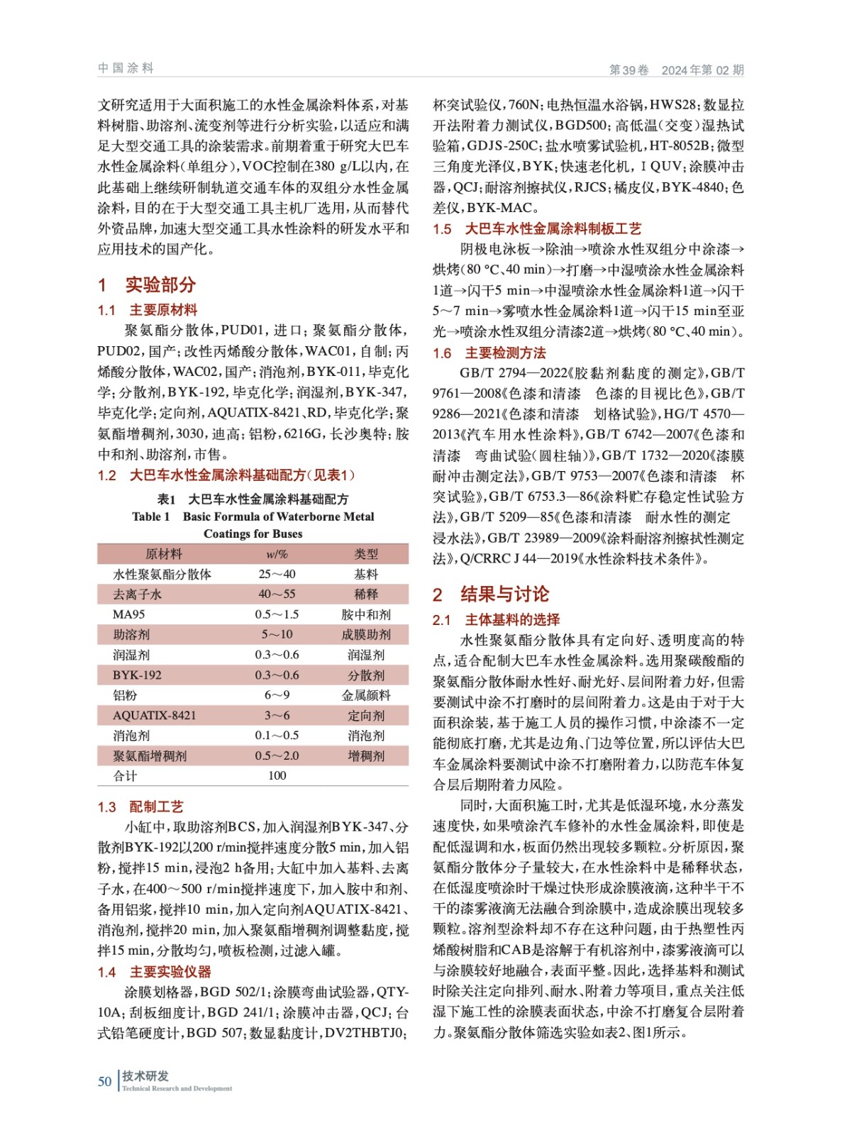摘要:研究了大型交通工具的涂裝特點,設計大型交通工具水性金屬閃光漆的配方組成,通過主體基料、輔助基料、定向劑、鋁粉、助溶劑等的合理搭配,配合不同型號的調合水或固化劑,使水性金屬閃光漆施工性滿足要求,尤其是適應低濕環境下大面積涂裝,漆霧融合性好,涂膜平順,金屬定向排列好,整體外觀亮麗且各項性能符合主機廠的技術標準。