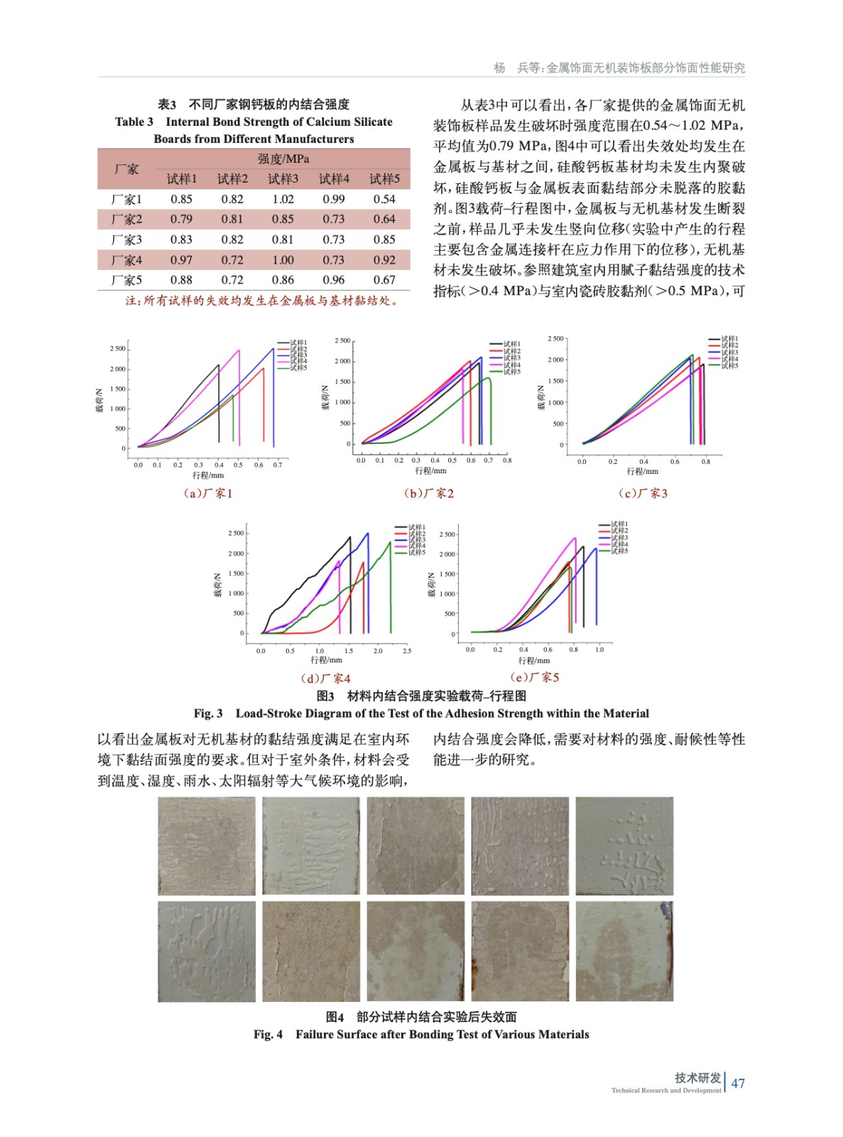 摘要:參照涂料相關的標準研究了金屬飾面無機裝飾板主要飾面性能及金屬板與無機板的黏結強度。結果表明:金屬飾面無機裝飾板具有卓越的涂層附著力、抗沖擊性能,涂層附著力等級為0級,切割邊緣完全平滑、網格內無脫落。30 cm高度的沖擊后,涂層未出現開裂,背面硅酸鈣板未出現凸起和裂紋,與金屬材料鋁單相當,可以替代部分鋁單板、搪瓷板,應用于軌道交通樞紐站、過街隧道等,以降低工程成本。由于成膜方式為化學成膜,洗刷10 000次后,金屬飾面無機裝飾板的飾面層中間100 mm長度的洗刷區無明顯凹痕;參照GB/T 17657—2022中的內結合強度方法測試金屬板與無機板之間的黏結強度,具有一定的可行性,金屬板與無機基材黏結處強度均在0.54 MPa以上,滿足室內環境下黏結面強度要求。