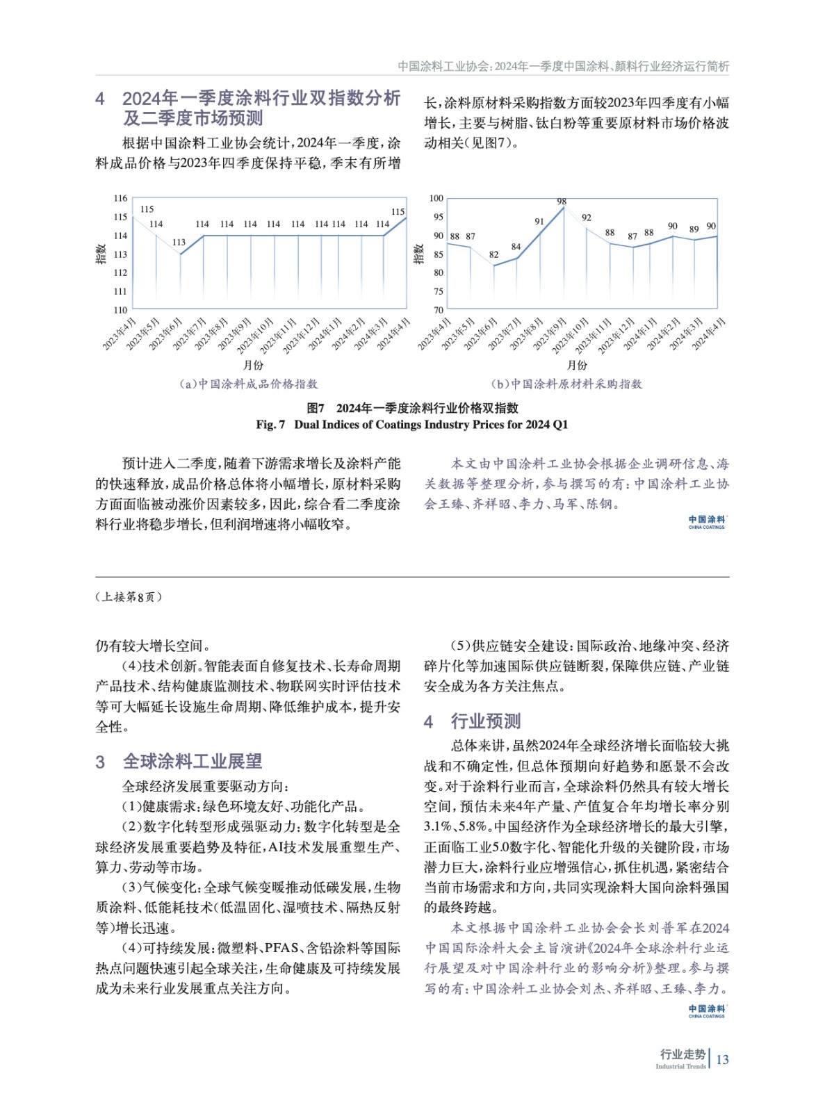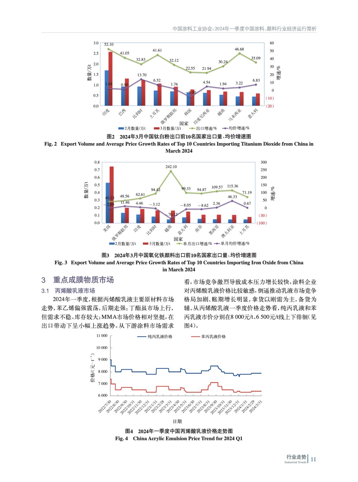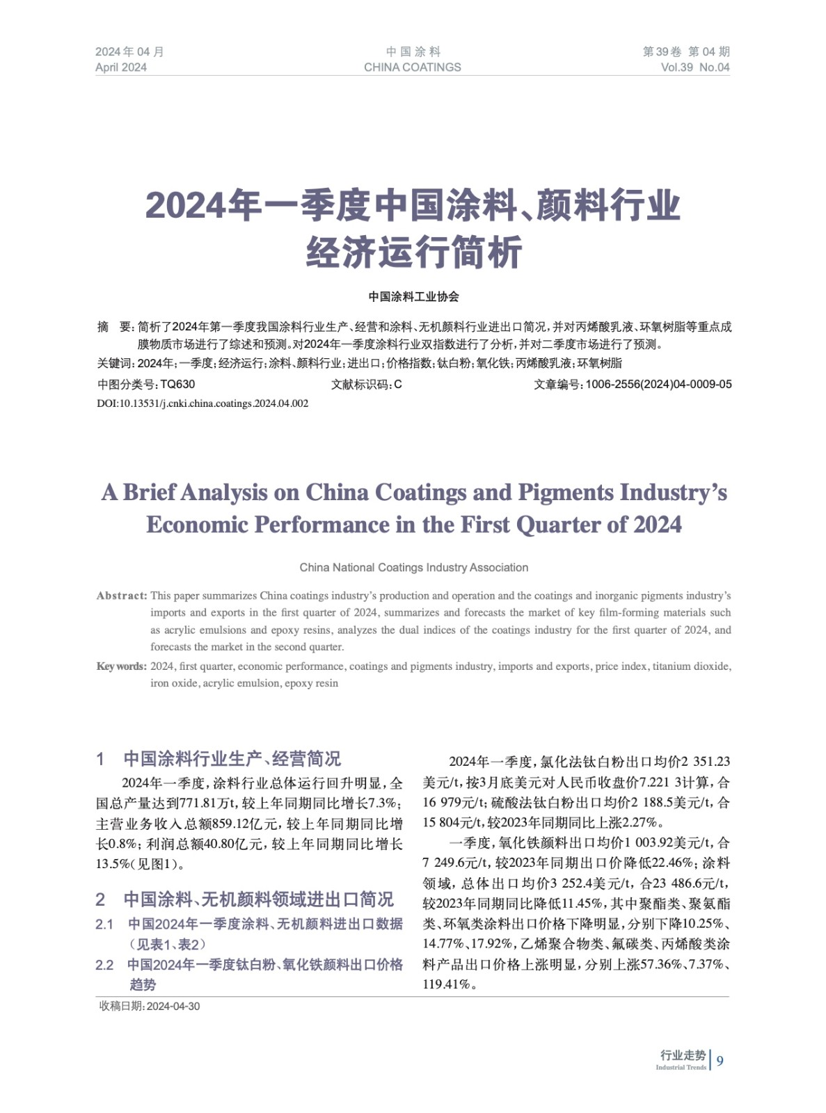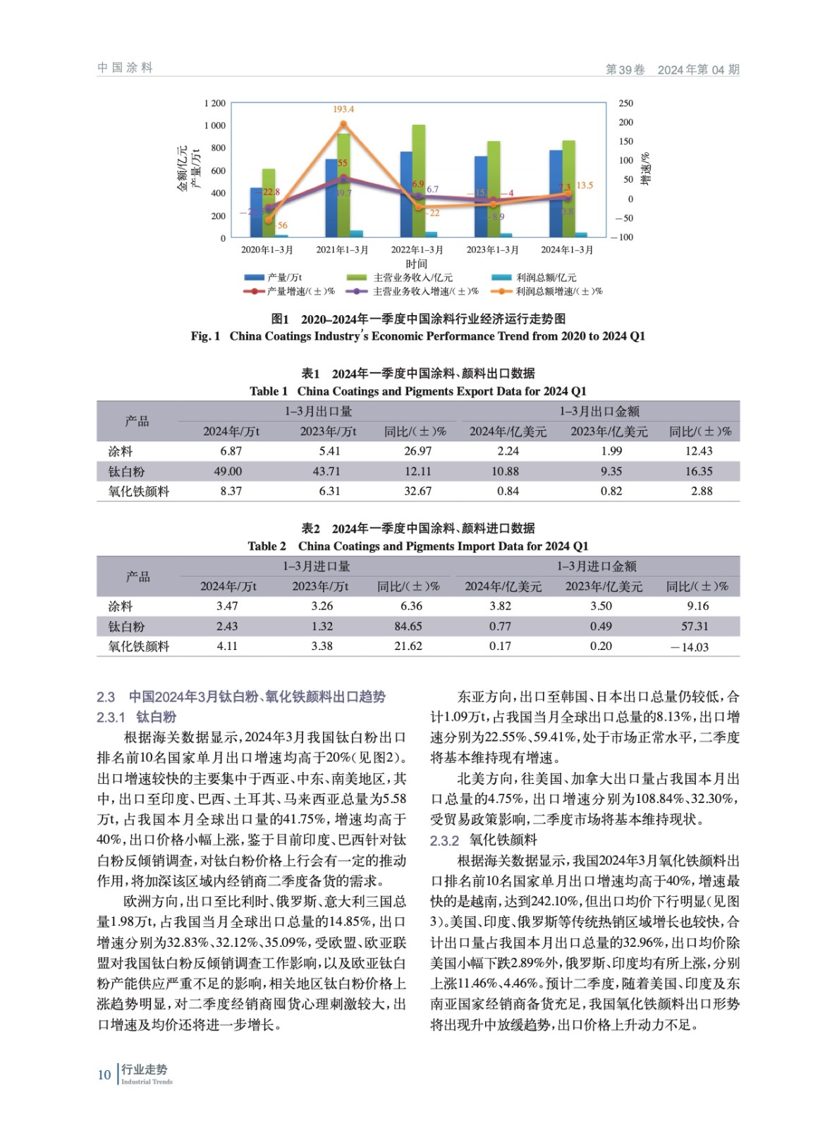 2024年 一季度 經(jīng)濟(jì)運(yùn)行 涂料、顏料行業(yè) 進(jìn)出口 價(jià)格指數(shù) 鈦白粉 氧化鐵 丙烯酸乳液 環(huán)氧樹(shù)脂 第202404期