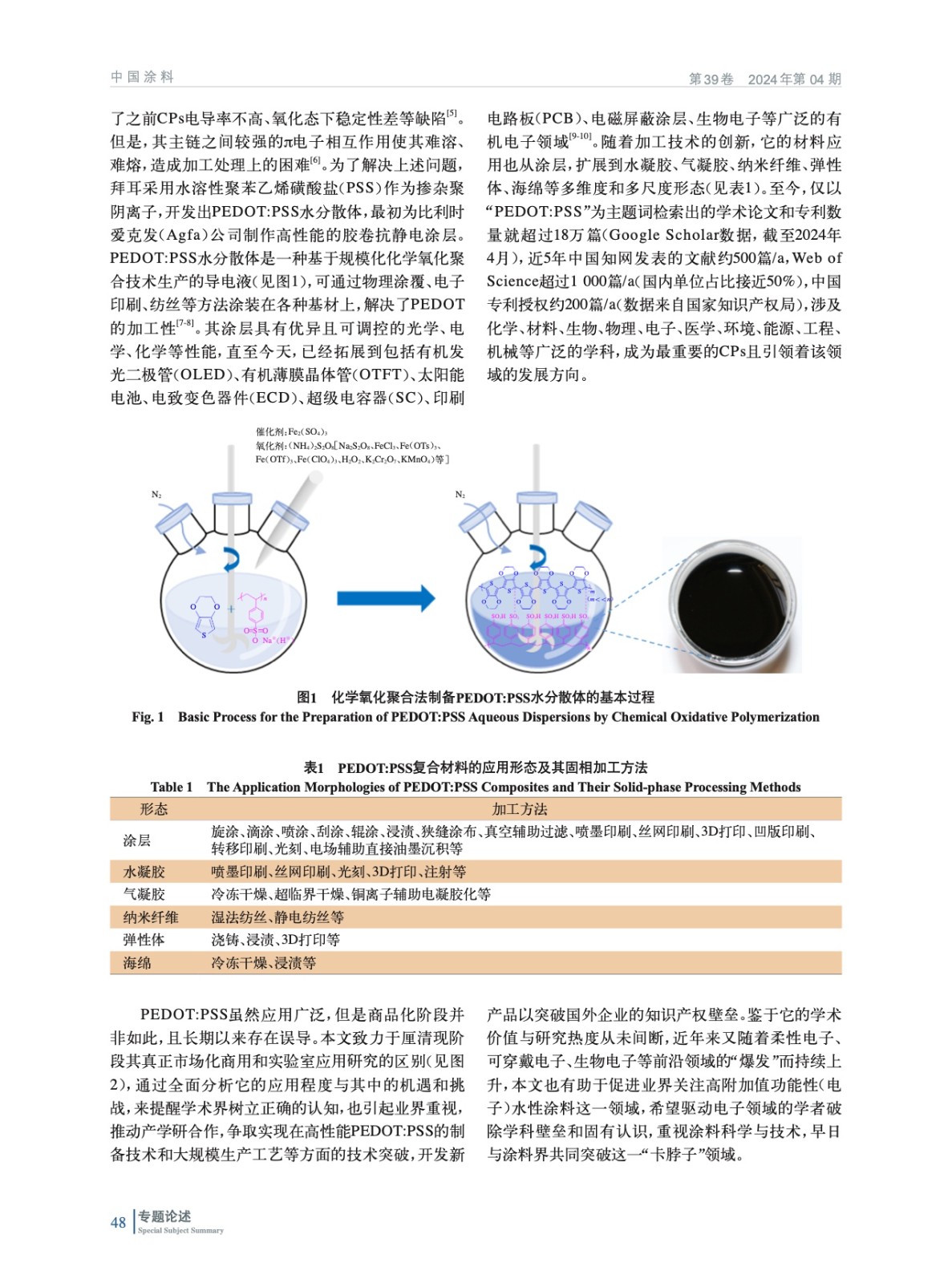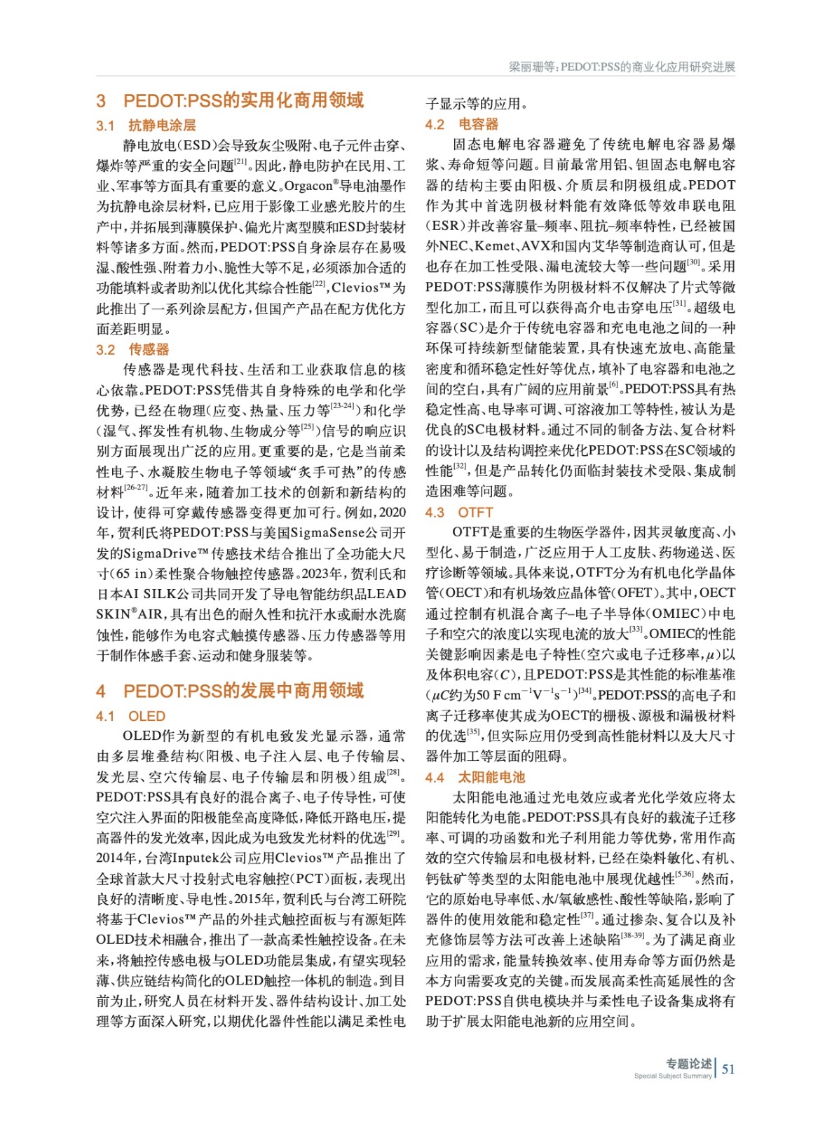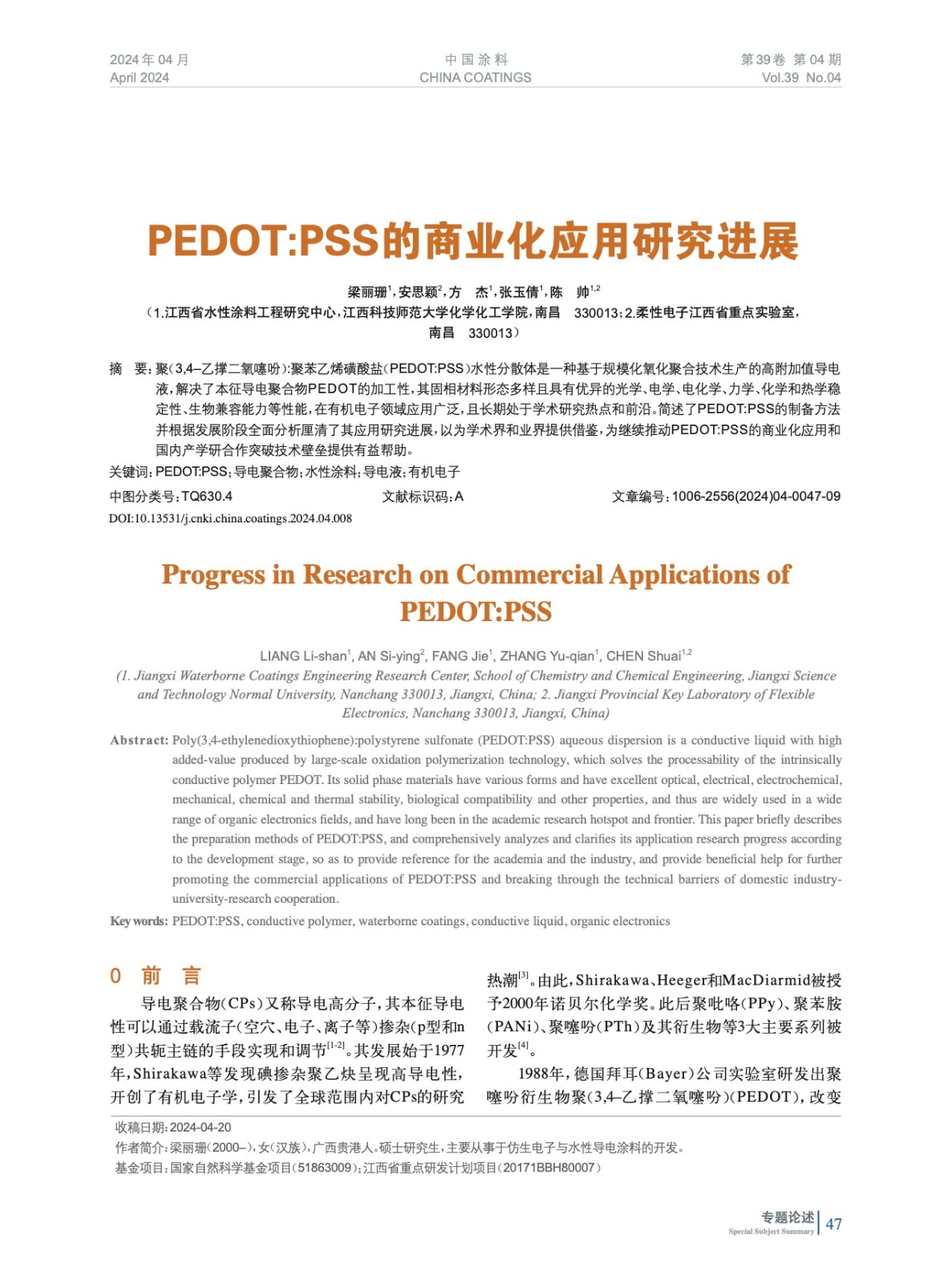 摘要:聚(3,4–乙撐二氧噻吩):聚苯乙烯磺酸鹽(PEDOT:PSS)水性分散體是一種基于規模化氧化聚合技術生產的高附加值導電液,解決了本征導電聚合物PEDOT的加工性,其固相材料形態多樣且具有優異的光學、電學、電化學、力學、化學和熱學穩定性、生物兼容能力等性能,在有機電子領域應用廣泛,且長期處于學術研究熱點和前沿。簡述了PEDOT:PSS的制備方法并根據發展階段全面分析厘清了其應用研究進展,以為學術界和業界提供借鑒,為繼續推動PEDOT:PSS的商業化應用和國內產學研合作突破技術壁壘提供有益幫助。