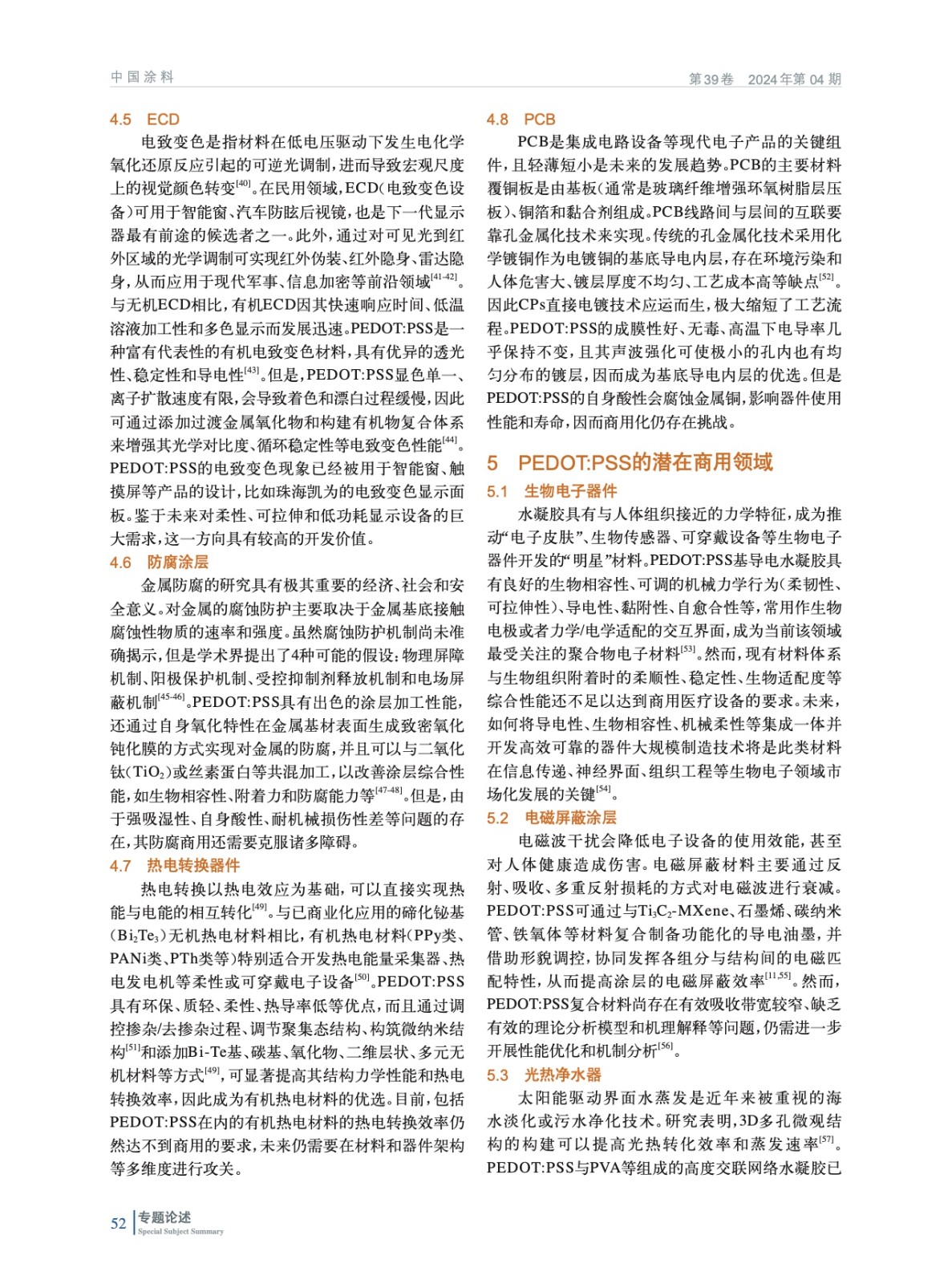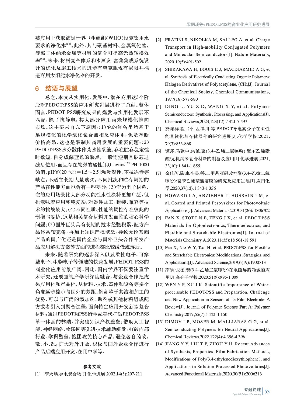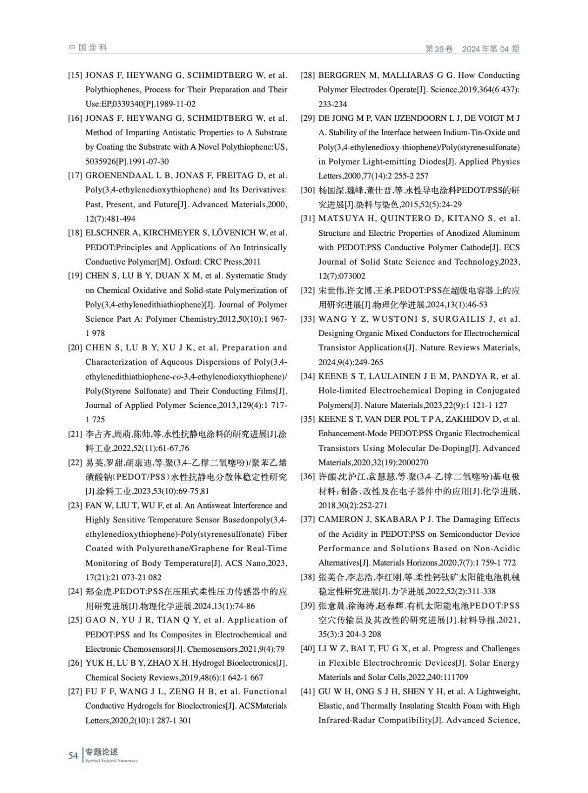 摘要:聚(3,4–乙撐二氧噻吩):聚苯乙烯磺酸鹽(PEDOT:PSS)水性分散體是一種基于規模化氧化聚合技術生產的高附加值導電液,解決了本征導電聚合物PEDOT的加工性,其固相材料形態多樣且具有優異的光學、電學、電化學、力學、化學和熱學穩定性、生物兼容能力等性能,在有機電子領域應用廣泛,且長期處于學術研究熱點和前沿。簡述了PEDOT:PSS的制備方法并根據發展階段全面分析厘清了其應用研究進展,以為學術界和業界提供借鑒,為繼續推動PEDOT:PSS的商業化應用和國內產學研合作突破技術壁壘提供有益幫助。
