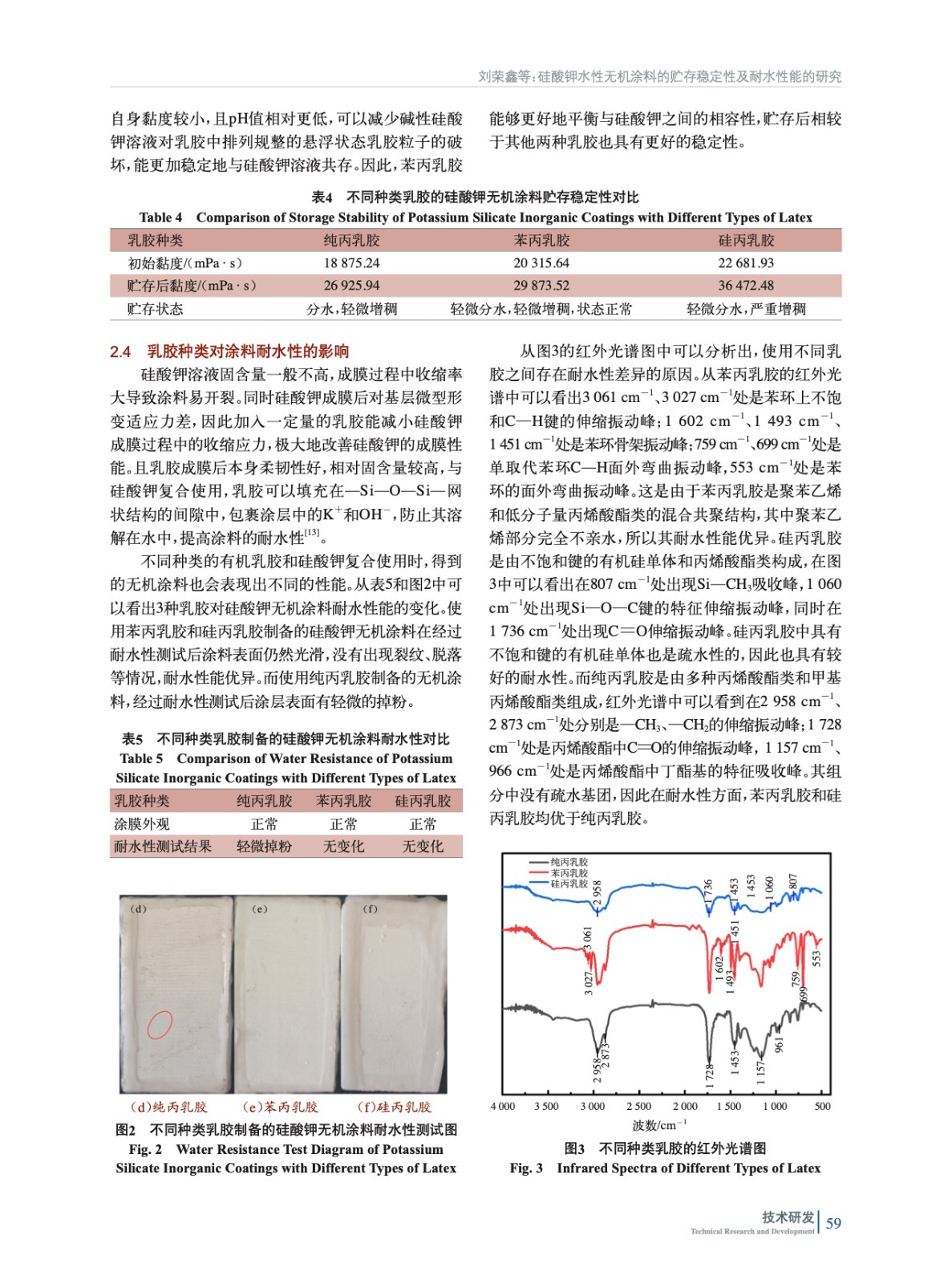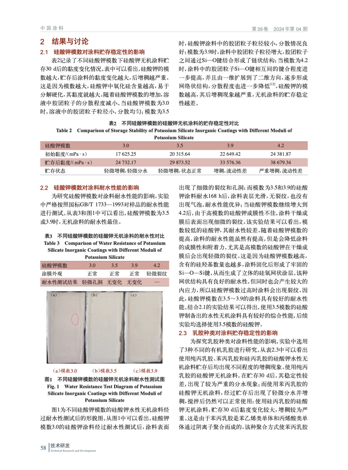 摘要:主要研究了不同模數的硅酸鉀和不同種類的有機乳膠對涂料貯存穩定性和耐水性能的影響。通過對比實驗制備了涂料樣品,并對涂料的黏度、耐水性、貯存穩定性等進行了表征。實驗結果表明:硅酸鉀模數為3.5的無機涂料貯存穩定性最好,硅酸鉀模數在3.5~3.9的耐水性能較為優異;對比了純丙乳膠、苯丙乳膠和硅丙乳膠對涂料性能的影響,結果發現使用苯丙乳膠的硅酸鉀水性無機涂料貯存穩定性最好,且苯丙乳膠和硅丙乳膠的耐水性能均優于純丙乳膠。本實驗使用3.5模數硅酸鉀和苯丙乳膠所制備的硅酸鉀水性無機涂料性能滿足TCSTM 00632.3—2022《建筑涂飾工程用涂料產品技術要求 第3部分:無機建筑涂料體系》的標準要求。