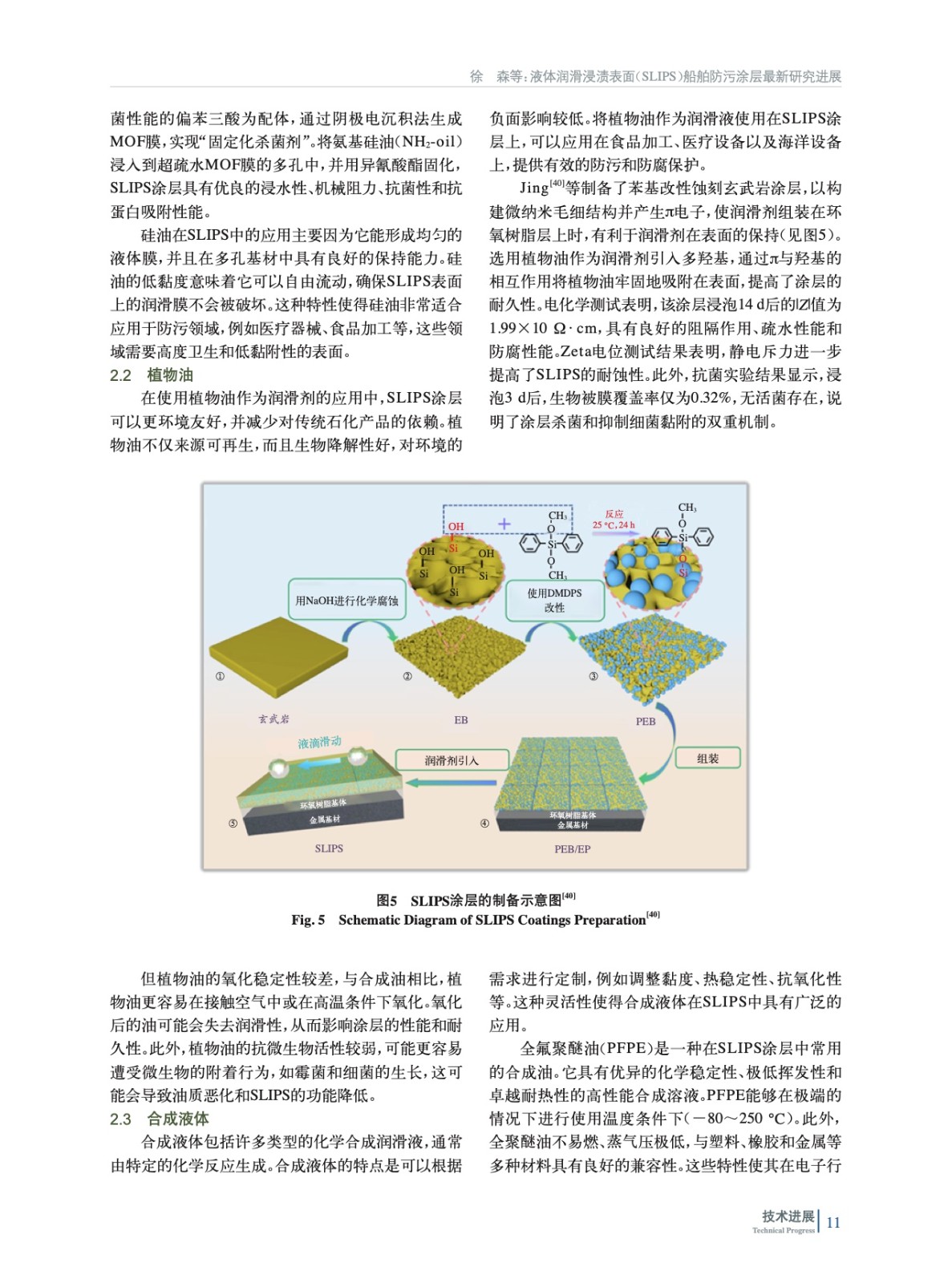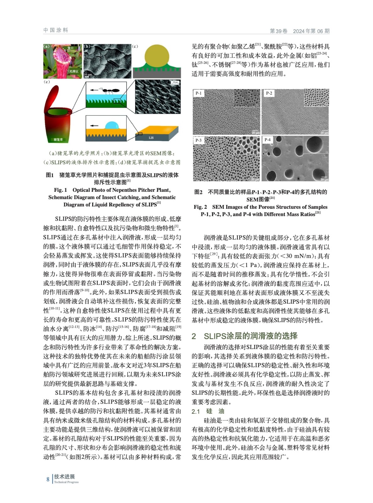 綜述了近3年來關于液體潤滑浸漬表面(SLIPS)船舶防污涂層的研究進展,特別是潤滑液的選擇與涂層的結構設計,以及這些因素如何影響涂層的整體性能,以期為未來的研究提供最新思路及研究方法。
