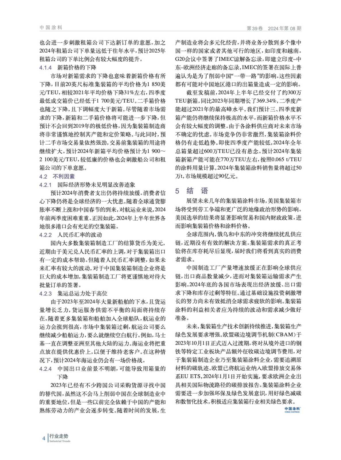 綜述了2023年我國集裝箱制造業市場和集裝箱涂料市場總體情況,并對集裝箱涂料技術進行分析,預測了2024年集裝箱涂料市場發展趨勢。