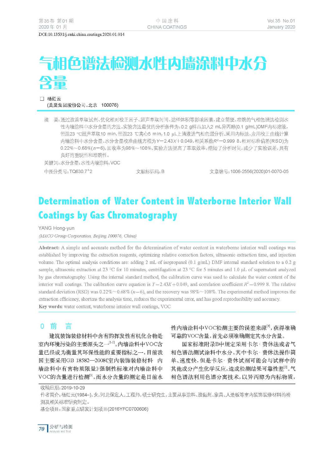 氣相色譜法檢測水性內墻涂料中水分含量