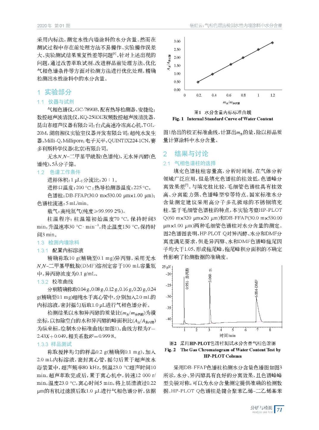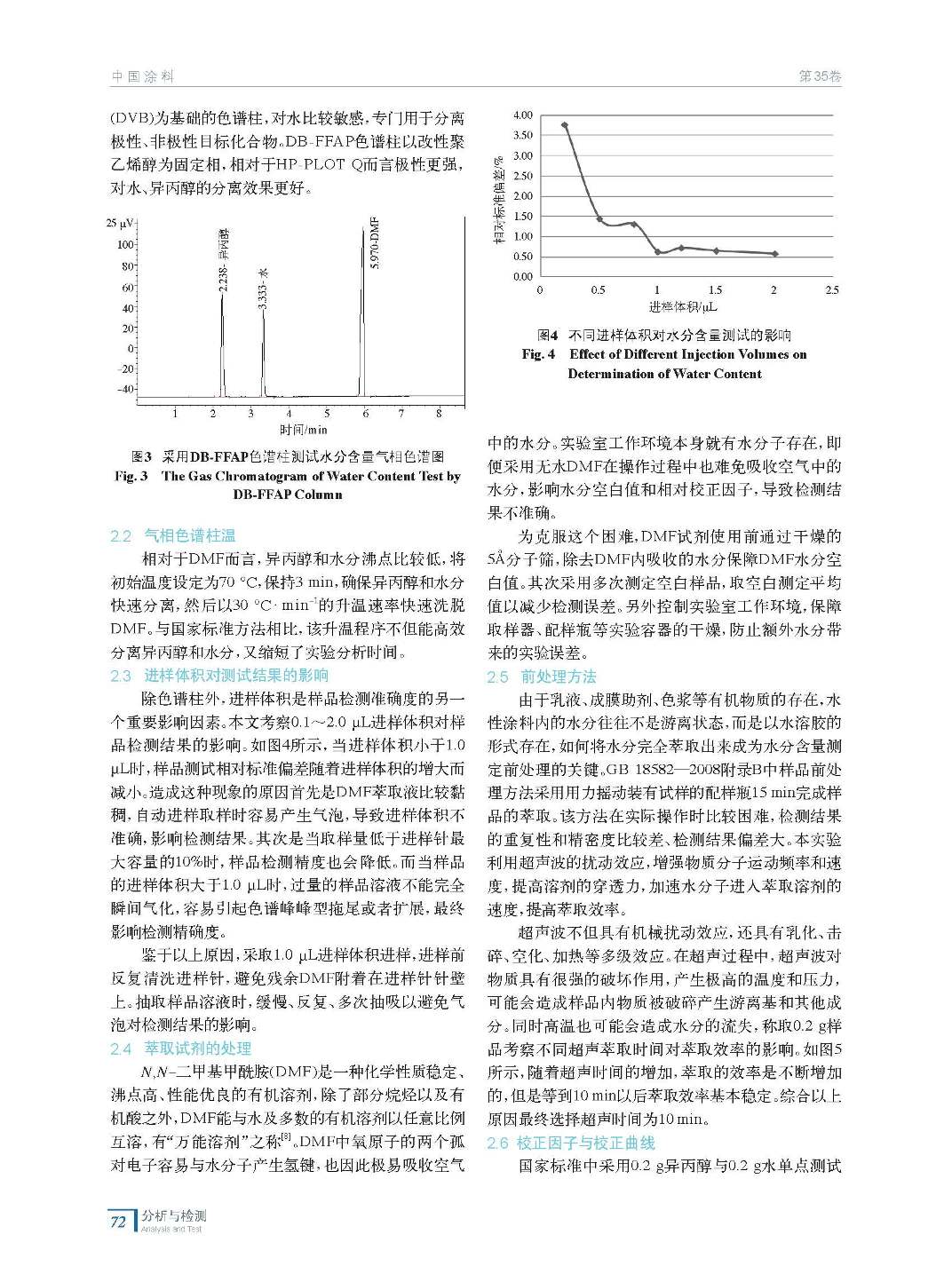 通過改善萃取試劑、優化相對校正因子、超聲萃取時間、進樣體積等影響因素,建立簡便、準確的氣相色譜法檢測水性內墻涂料中水分含量的方法。該實驗方法提高了萃取效率,縮短了分析時間,減少了實驗誤差,具有良好的重現性和準確性。