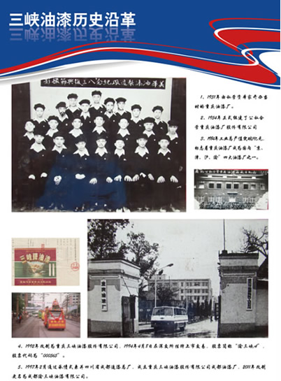 重慶,有一座環境優美的園林式企業------重慶三峽油漆股份有限公司,它始創于1931年,是國內最早建立的涂料生產企業之一。1954年公私合營成立重慶油漆廠,1992年改制為股份有限公司,1994年公司發行的A股股票在深圳證券交易所掛牌上市,股票簡稱:渝三峽A,股票代碼:000565。渝三峽是中國最早的上市公司之一,目前是我國資本市場中碩果僅存的以油漆涂料生產為主營業務的國有控股上市公司,也是我國涂料行業國有控股企業中生產規模最大、品種最為齊全的綜合性涂料生產企業。經過八十余年的快速發展,公司規模不斷擴大,總部占地面積375畝,年生產能力10萬噸,產品包括防腐涂料、工業涂料、汽車涂料、建筑涂料、家具涂料五大系列,800多個品種、2000多個花色。
