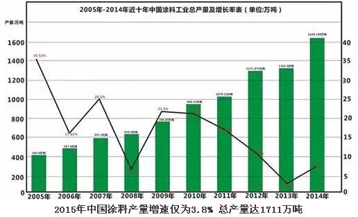 2015年中國涂料產(chǎn)量增長3.8%,銷售額增長7.1%,利潤增長10.9%。據(jù)悉,2015年是近10多年來第二個低速增長期,2013年我國涂料總產(chǎn)量達1303.349萬噸,同比增長3.58%。