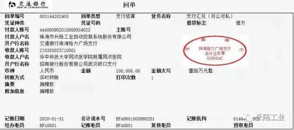 武漢疫情的發(fā)展也牽動(dòng)著長陸人的心,今天,珠海市長陸工業(yè)自動(dòng)控制系統(tǒng)股份有限公司(簡稱長陸工控)向武漢市華中科技大學(xué)同濟(jì)醫(yī)學(xué)院附屬同濟(jì)醫(yī)院捐贈(zèng)人民幣10萬元,用于開展抗擊新型冠狀病毒感染的肺炎疫情之需,長陸公司希望以此為抗擊疫情盡一份綿薄之力。