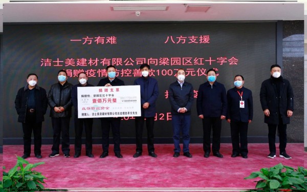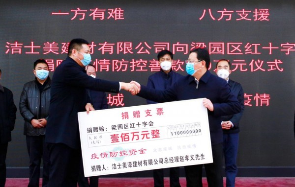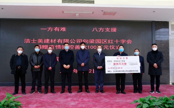 2月2日,上海潔士美建材有限公司董事長趙孝文先生向河南省商丘市梁園區(qū)紅十字會捐助100萬元人民幣(款項已到帳),出席捐款儀式的領(lǐng)導(dǎo)有梁園區(qū)委書記薛鳳林、梁園區(qū)人民政府區(qū)長張兵、副區(qū)長陳斌、何玉東等各級領(lǐng)導(dǎo)。