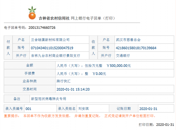 1月31日,蘭舍硅藻新材料有限公司向武漢市慈善總會捐款人民幣50萬元,作為疫情救助專款使用,支援武漢抗擊疫情,同舟共濟,共度難關。