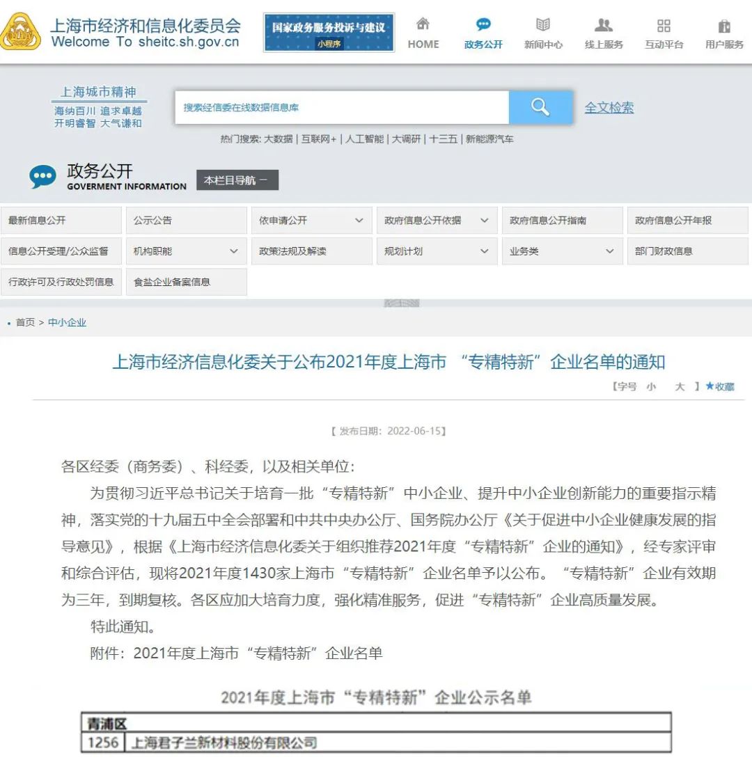 近日,上海市經濟和信息化委員會發布了2021年度上海市“專精特新”企業公示名單,上海君子蘭新材料股份有限公司榮登“專精特新”企業榜單!