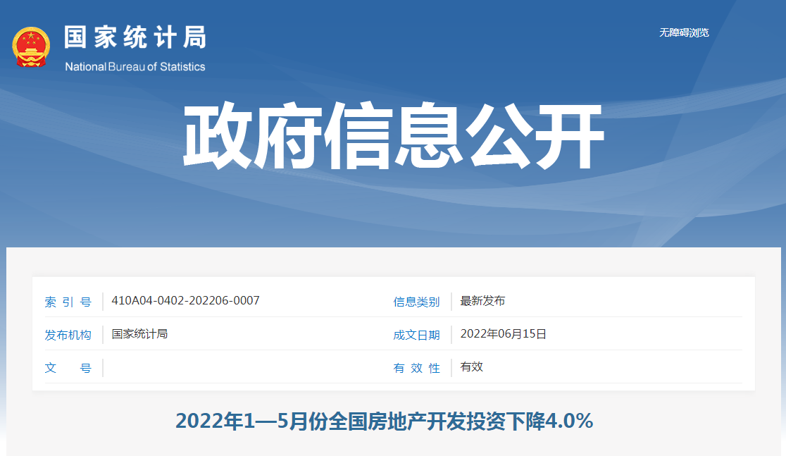 數據|2022年1—5月份全國房地產開發投資下降4.0%