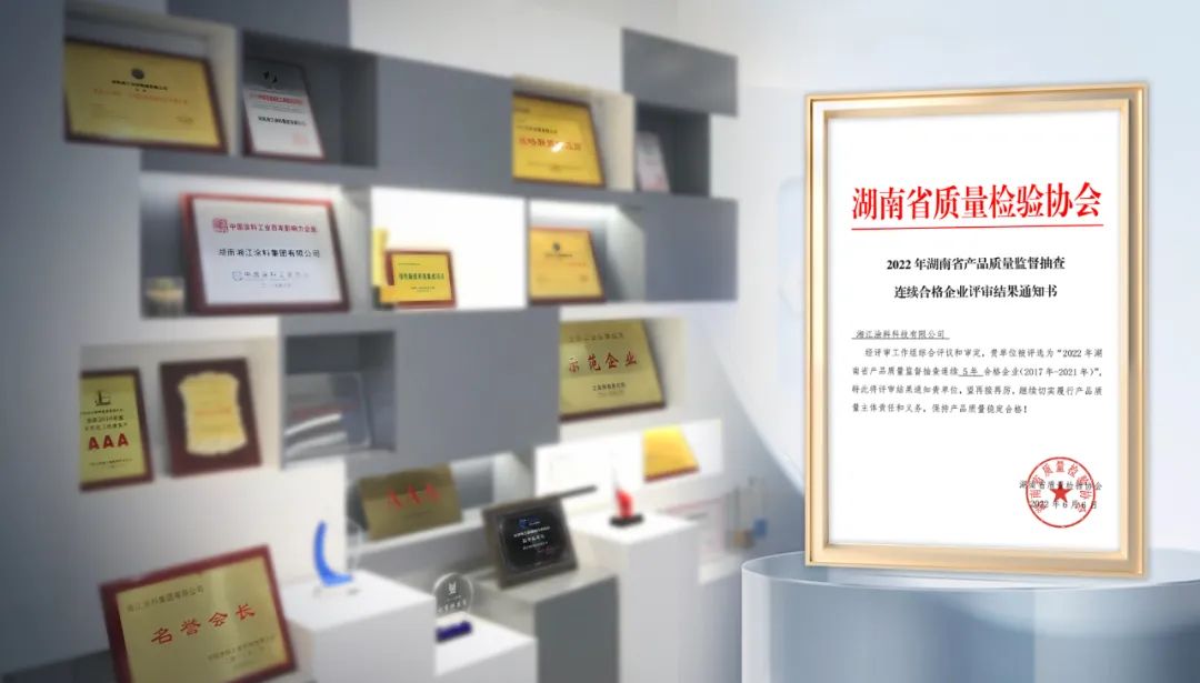 2022年6月,湘江涂料科技有限公司被評選為“2022 年湖南省產品質量監督抽查連續5年合格企業(2017 年-2021 年)”