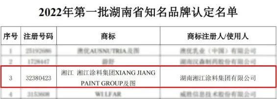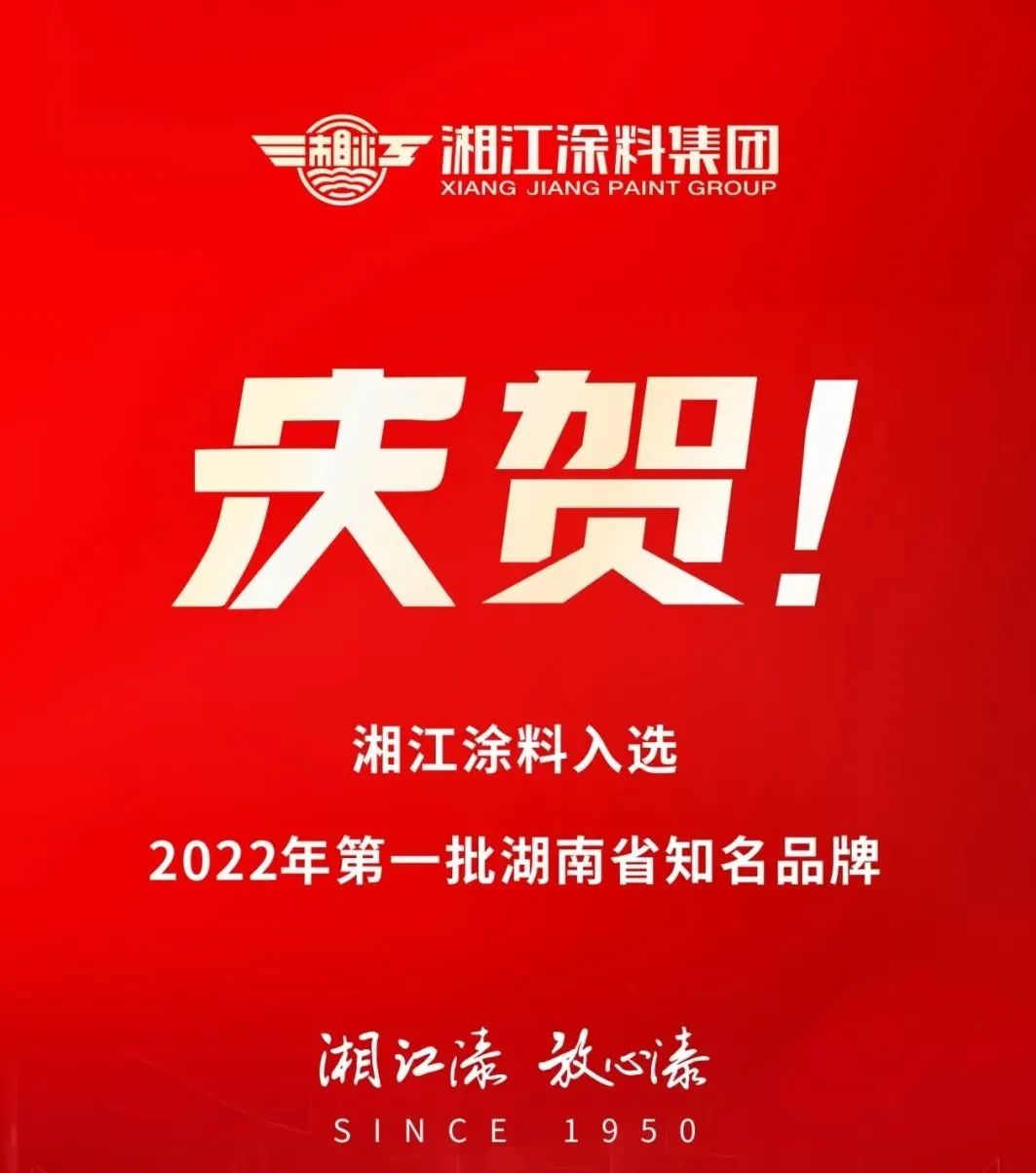 近日,湖南省商標品牌協會發布2022年第一批湖南省知名品牌認定名單,湘江涂料集團憑借強勁品牌實力第一批入選。