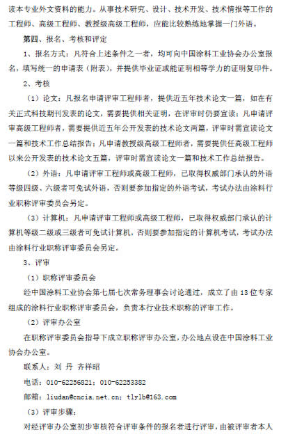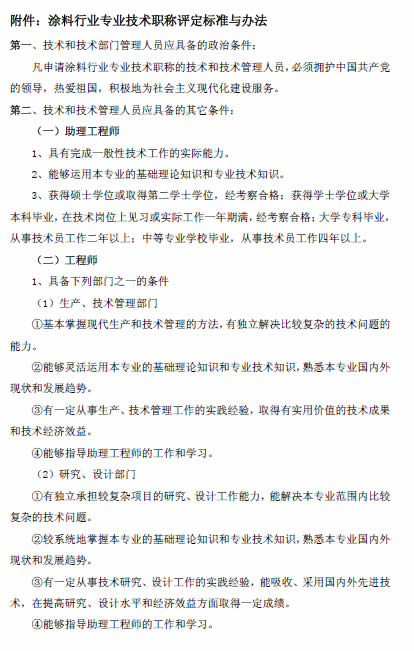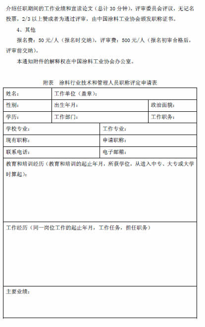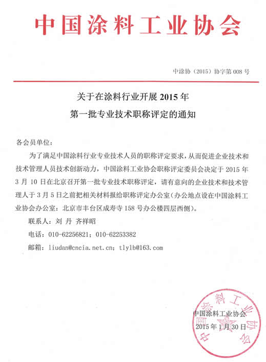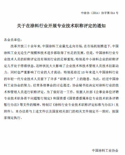 為了滿足中國涂料行業(yè)專業(yè)技術人員的職稱評定要求,從而促進企業(yè)技術和技術管理人員技術創(chuàng)新動力,中國涂料工業(yè)協(xié)會職稱評定委員會決定于2015年3月10日在北京召開第一批專業(yè)技術職稱評定,請有意向的企業(yè)技術和技術管理人于3月5日之前把相關材料報給職稱評定辦公室(辦公地點設在中國涂料工業(yè)協(xié)會辦公室:北京市豐臺區(qū)成壽寺158號辦公樓四層西側(cè))。詳見下文附件一、附件二或《涂料行業(yè)工程技術人員和管理人員職稱評定標準與辦法》[中涂協(xié)(2014)協(xié)字第014號文](http://www.chinacoatingnet.com/plus/view.php?aid=2578)。