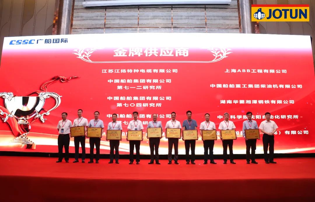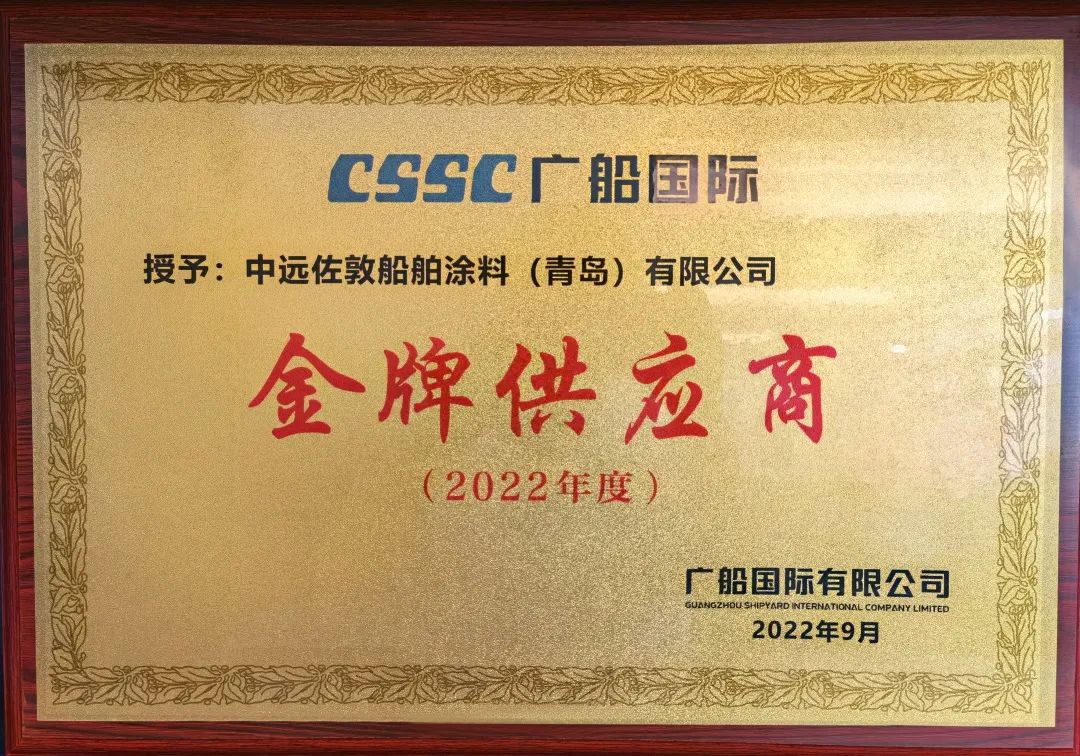 中遠佐敦跟廣船國際有多年合作歷史,憑借優異而且穩定的產品質量,良好的產品配送以及技術服務,業績和市場份額不斷增長,成為目前廣船國際主要的油漆供應商。此次獲頒“金牌供應商”,是廣船國際在其1176家合格供應商中評選出來的10家,中遠佐敦也是唯一一家獲獎的涂料供應商,這是繼2018年中遠佐敦獲得該公司“優秀供應商”后再次獲得廣船國際的肯定。