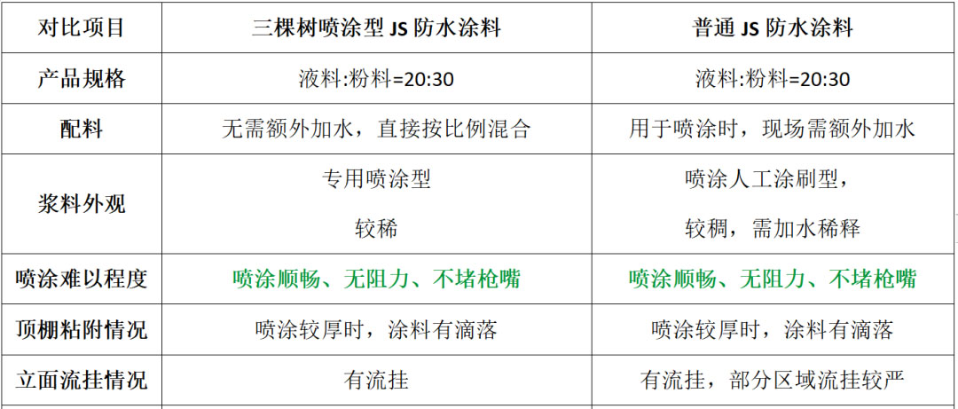 市面上普通JS用于現(xiàn)場噴涂,需要額外加水稀釋,而現(xiàn)場加水難以控制量,影響組分配比,間接影響成膜效果。三棵樹防水推出的新型SGW102PT噴涂型聚合物水泥防水涂料(JSⅡ)施工前無需另外加水,解決了由于現(xiàn)場施工無法控制配比的問題,保留防水涂料自身的水乳比例。產(chǎn)品采用機械噴涂施工,固化后形成致密、高強、堅韌、耐久的彈性涂膜防水層。