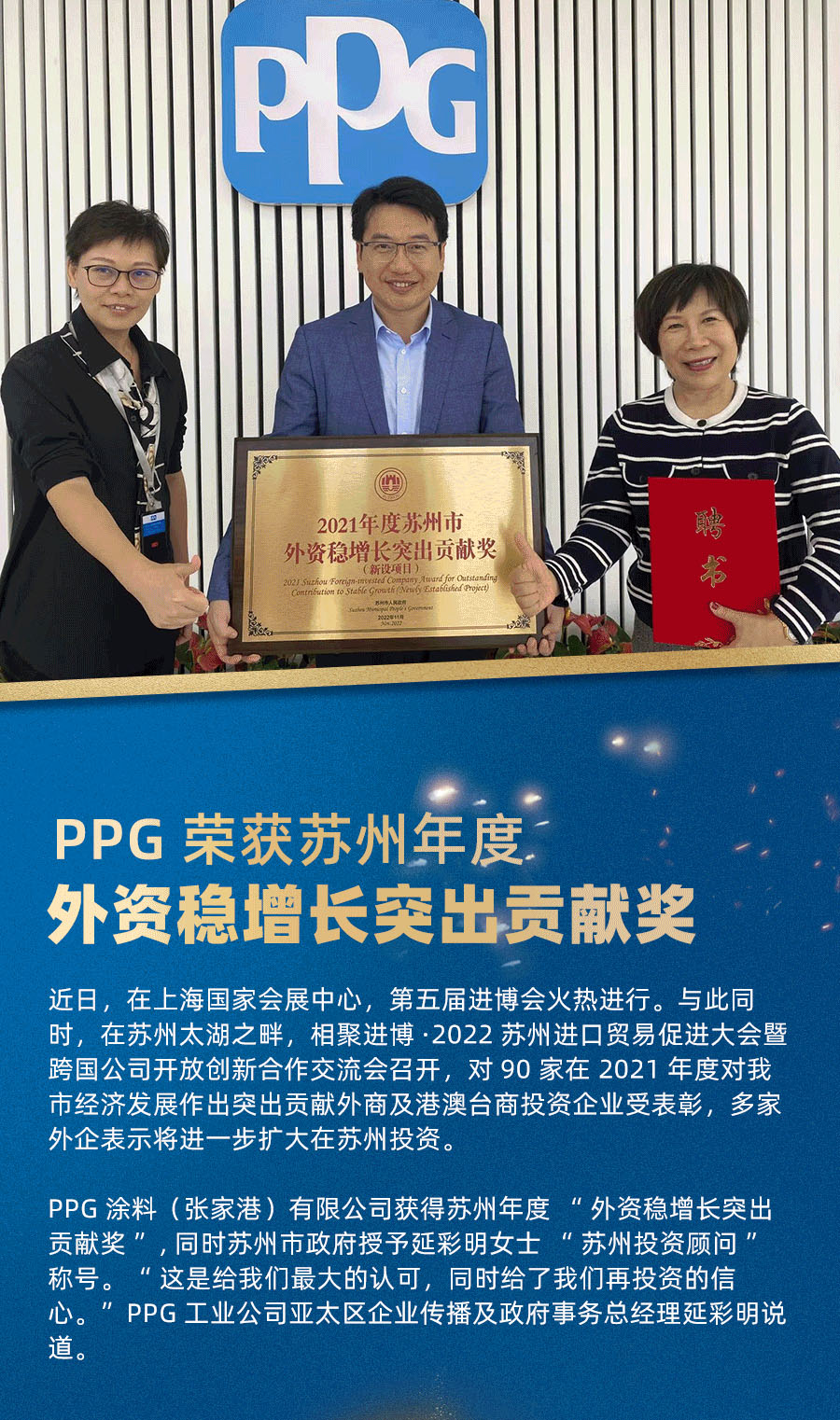 近日,PPG榮獲蘇州年度“外資穩(wěn)增長突出貢獻獎”。