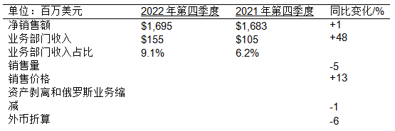 與去年同期相比,功能涂料業務部門第四季度凈銷售額僅略有下降,因為銷售量下滑、資產剝離、俄羅斯業務縮減和負面的外幣折算幾乎全被各個業務領域的銷售價格上漲所抵消。