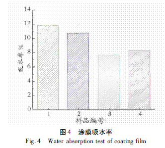 涂膜的吸水率和耐水性對(duì)涂層的防腐性能有很大影響,涂層的吸水率越大,耐水性越差,防腐性能越差。4種樣品涂膜的吸水率如圖4所示。