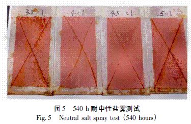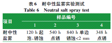 涂層耐中性鹽霧試驗(yàn)結(jié)果如表6和圖5所示。