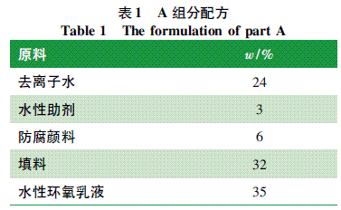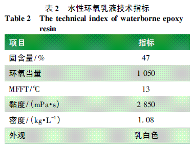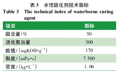 添加去離子水及部分助劑,攪拌15min左右;添加防腐顏料及填料,攪拌30~60min;添加水性環(huán)氧乳液及部分助劑,攪拌30min左右,制得A組分。水性環(huán)氧乳液和固化劑的技術(shù)指標(biāo)分別如表2、表3所示。