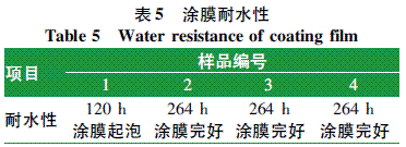 由表5可以看出,當(dāng)固化劑用量過多時(shí),涂膜耐水性較差,在浸泡120h的時(shí)候,涂膜表面呈現(xiàn)較為密集的小泡,這說明涂層中剩余的未參加固化反應(yīng)的固化劑對(duì)耐水性影響比較大。其他比例下,涂膜耐水時(shí)間均超過了264h,能夠滿足一般工業(yè)涂料的耐水性要求。
